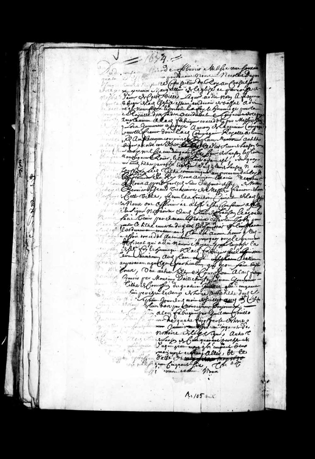 - Transcription du texte avec orthographe modernisée : «Du dix-neuvième jour de février mille six cent soixante-quatorze. Est comparu par-devant nous Nicolas Dupont, écuyer, Sieur de Neuville, conseiller du Roy au Conseil Souverain de ce pays, premier marguillier de l'église et paroisse de notre-Dame de cette ville, lequel au dit nom et faisant pour la fabrique de la dite église, étant en devoir de vassal, a dit et déclaré qu'il nous faisait et portait la foi et hommage pour la Compagnie royale des Indes Occidentales, seigneurs de ce pays, pour un emplacement à la dite fabrique concédé par Messire Jean de Lauson (Lauzon), lors gouverneur de ce pays, au nom de l'ancienne Compagnie de la Nouvelle-France, dont la dite Compagnie royale a les droits, le dit emplacement compris en une place mentionnée au titre à la fabrique accordé comme dit est par le dit Sieur de Lauson (Lauzon) le vingtième mai mille six cent cinquante-six, signé de Lauson (Lauzon), et plus bas par Monseigneur, Rouer, et le dit plan ayant été perdu quoique mentionné au dit titre paraphé et signé du dit Sieur de Lauson (Lauzon) ne varietur les dits jours et an, le dit titre communiqué au procureur du Roy avec le dit procureur du Roy nous aurions examiné le contenu du plan à nous apporté par le dit Sieur Dupont, assisté de Messire Henri de Bernières, grand vicaire de Messire François de Laval, évêque de cette ville, faisant les fonctions curiales de la dite église, lesquels nous ont affirmée et attesté être conforme à celui paraphé et signé ne varietur du dit Sieur de Lauson (Lauzon) et en outre avons faits venir par-devant nous Charles Jobin pour nous apporter le titre en vertu duquel il jouissait de l'emplacement sur lequel il est de nuement contenu au dit plan et avons trouvé que le dit emplacement était concédé antérieurement pour quoi Ouï le procureur du Roy et fiscal qui a dit n'avoir moyen pour empêcher la réception des dits foi et hommage par la dite fabrique pour la jouissance des dites terres mentionnées au dit plan accordées auparavant à quelques particuliers qui y ont fait bâtir des maisons, vu autres titres de concessions à la dite fabrique accordées savoir par Monsieur Dailleboust (D'Ailleboust), ci-devant gouverneur, un titre de concession du quatrième juillet mille six cent cinquante et un de trente-huit perches et demi de terre autre titre du dit Sieur Dailleboust (D'Ailleboust) du septième jour du dit mois de juillet au dit an, le dit titre signé Dailleboust (D'Ailleboust), et plus bas par Monseigneur Boujonnier, contrat de concession à la dite fabrique par Guillaume Couillard et Guillemette Hebert (Hébert), sa femme, de quatre-vingt perches de terre (...) en date du quinzième janvier mille six cent cinquante-deux passé par-devant Audouart (Audouard) notaire de lui signé, autre titre de concession par le dit Sieur de Lauson (Lauzon) de cent quarante perches de terre ou environ, en date du quinzième mai mille six cent cinquante-deux (...) par la dite fabrique en main morte et franc alleu, et le (...) ci-dessus daté du (...) mille six cent cinquante-six, tout (...) ayant été par nous examinés, nous avons reçu et recevons le Sieur Dupont au dit nom et faisant pour la dite fabrique en ses foi et hommage et déclaration et en ce faisant avons ordonné que la dite fabrique jouira pleinement et paisiblement à l'avenir des choses mentionnées au plan qui nous a été représenté de nous présentement paraphé double ne varietur un d'iceux remis au greffier et l'autre rendu en franche aumône à perpétuité sans aucune charge avec pouvoir de donner à cens et rentes part ou portion et même quelques places accordées à quelques particuliers et les maisons qu'ils y ont fait bâtir seront et appartiendront à la censive de la dite fabrique au désir du dit titre du vingtième mai mille six cent cinquante-six signé de Lauson (Lauzon) et plus bas par Monseigneur Rouer dont acte et a signé. L. T. Chartier Dupont Peuvret.»