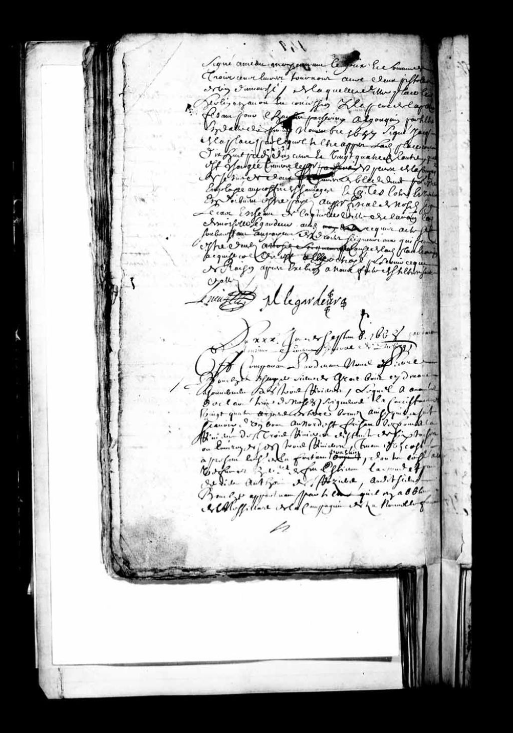 - Transcription du texte avec orthographe modernisée : «Du trentième jour de septembre 1668, par-devant Monsieur le lieutenant général de Québec. Est comparu par-devant nous Pierre Boucher, écuyer, Sieur de Grosbois, ci-devant gouverneur des Trois-Rivières, lequel a avoué et déclaré tenir de nos dits seigneurs la consistance de vingt-quatre arpents de terre bornés ainsi qu'il en suit savoir, d'un bout au nord-est faisant le fond de la rivière des Trois-Rivières, distante de six toises ou environ des dites Trois-Rivières, tenant d'un côté à présent le Sieur de Lafontaine Poulain, d'autre côté à la veuve et héritiers de feu Etienne Lafond, et par derrière Antoine des Roziers, au dit Sieur Boucher appartenant par titre qu'en a obtenu de Messieurs de la Compagnie de la Nouvelle-France, ci-devant seigneurs, en date du vingt-neuf mars mille six cent quarante-neuf à nous exhibé, à la charge de six deniers de cens pour chacun des dits vingt-quatre arpents le dit cens portant lods et ventes &., &., le dit titre signé Lamy, enregistré le vingt-neuvième mai mille six cent cinquante, du temps de Monsieur Dailleboust (D'Ailleboust), ci-devant gouverneur, le dit enregistrement signé Boujonnier, de laquelle déclaration le dit Sieur Boucher nous a requis acte à lui octroyé à la charge du dit cens, droits et devoirs seigneuriaux tant pour le passé que pour l'avenir, et a signé. Item, le dit Sieur Boucher a avoué et déclaré tenir de nos dits seigneurs un emplacement sis au lieu des Trois-Rivières au-dessous de la plate forme ou est basty le fort contenant quinze toises de largeur sur trente de profondeur tenant d'un côté Urbain Baudry (Beaudry) dit Lamarche, d'autre côté aux héritiers de défunt Gaspard Boucher, frère du dit Sieur Boucher, par-devant la rue tendant du bord du fleuve sur les coteaux, et par derrière les terres à lui appartenantes, le dit emplacement tenu par le dit Sieur Boucher à la charge d'un denier de cens portant lods et ventes, saisines et amendes &., &., de laquelle terre le dit Sieur Boucher nous a exhibé titre par lui obtenu de Monsieur Dailleboust (D'Ailleboust), lors gouverneur, en date du sixième juin mille six cent cinquante et un, ratifié la dite ancienne Compagnie par Monsieur de Lauson (Lauzon), lors gouverneur, le dix-septième juin mille six cent cinquante-deux, par laquelle ratification appert cens, sur lequel dit emplacement le dit Sieur Boucher nous a dit avoir fait bâtir une grange et une étable et nous a requis acte de sa dite déclaration, à lui octroyé, à la charge du dit cens et droits seigneuriaux. Item, le dit Boucher a avoué et déclaré tenir de nos dits seigneurs en roture une place au-dessous de la dite plateforme contenant vingt-quatre toises de long sur dix toises de large d'un bout et seize d'autre tenant d'un côté à la réserve pour briqueterie, d'autre côté à la commune, par-devant à la place qui va à la rivière et par derrière au dit Gaspard Boucher, à la charge d'un denier de cens portant lods et ventes &., &., et ainsi qu'il nous a apparu par titre à nous exhibé par le dit Sieur Boucher signé Duplessis, lors gouverneur des Trois-Rivières, ayant charge de Monsieur de Lauzon, lors gouverneur du pays, en date du quatrième avril mille six cent cinquante-deux et par la ratification au bas d'icelui titre qu'en a fait mon dit Sieur de Lauson (Lauzon), en date du cinq juin mille six cent cinquante-deux, lequel emplacement le dit Sieur Boucher nous a déclaré avoir réservé pour jardin, dont il nous a requis acte à lui octroyé à la charge du dit cens et droits seigneuriaux. Item, le dit Sieur Boucher a avoué et déclaré tenir de nos dits seigneurs une place située proche la commune pour faire un jardin de vingt-quatre toises de long sur quatorze de large la dite place tenant des deux côtés à la commune par-devant à la rue qui va du bourg à la commune et par derrière à la place commune à défunt Gaspard Boucher, au dit Sieur Boucher et à Urbain Baudry (Beaudry), à la charge de six deniers de cens portant lods et ventes, saisines et amendes payable au jour Saint-Rémi chef d'octobre, la dite place close de pieux, appartenante au dit Sieur Boucher par titre qu'il a obtenu de Monsieur de Lauson (Lauzon) en date du vingtième octobre mille six cent cinquante-cinq à nous exhibé dont il nous a requis acte à lui octroyé, à la charge du dit cens et autres droits seigneuriaux. Item, déclaré le dit Sieur Boucher tenir de nos dits seigneurs soixante arpents ou environ de terre en un îlet à lui concédé par défunt Monsieur de Lauson (Lauzon), lors gouverneur, à la charge de six deniers par arpent dans lequel dit îlet il a fait bâtir une grange, maison et étable, le dit îlet sis et situé dans la rivière des Trois-Rivières, de laquelle concession et titre obtenu du dit Sieur de Lauson (Lauzon) en l'année mille six cent cinquante-cinq ayant fait prêt, il nous a requis acte pour lui servir et valoir avec sa possession attendu qu'il y a plus de dix ans qu'il en jouit dont lui a été décerné acte à la charge du dit cens de six deniers par chacun arpent et autres droits qu'il appartiendrait, le dit cens portant lods et ventes &., &., payable au jour Saint-Rémi, au receveur du domaine, et a le dit Sieur Boucher signé pour les dites autres déclarations qu'il tient en roture de nos dits seigneurs. Boucher »