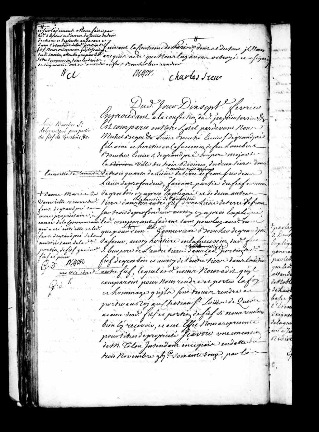 Acte de foi et hommage de Louis Boucher, écuyer, sieur de Grandpré, fils aîné et héritier de feu Lambert Boucher, de son vivant écuyer, sieur de Grandpré et major des Trois-Rivières, des deux tiers dans la moitié de la moitié de trois quarts de lieue moins sept arpents de terre de front sur deux lieues de profondeur, faisant partie du fief de Grosbois, et de deux autres tiers dans la moitié de la moitié dans un autre fief d'une lieue de terre de front sur trois de profondeur, le comparant faisant tant pour lui que pour Marie de Vauvrille (Vauvril), veuve du feu sieur de Grandpré, sa mère, propriétaire de la moitié de ladite portion de fief, et pour Geneviève Boucher de Grandpré, sa soeur, héritière de l'autre tiers dans la moitié de la moitié dans le fief de Grosbois et aussi de l'autre tiers dans l'autre moitié dudit autre fief, lequel acte de foi et hommage étant fait pour ladite partie du fief de Grosbois