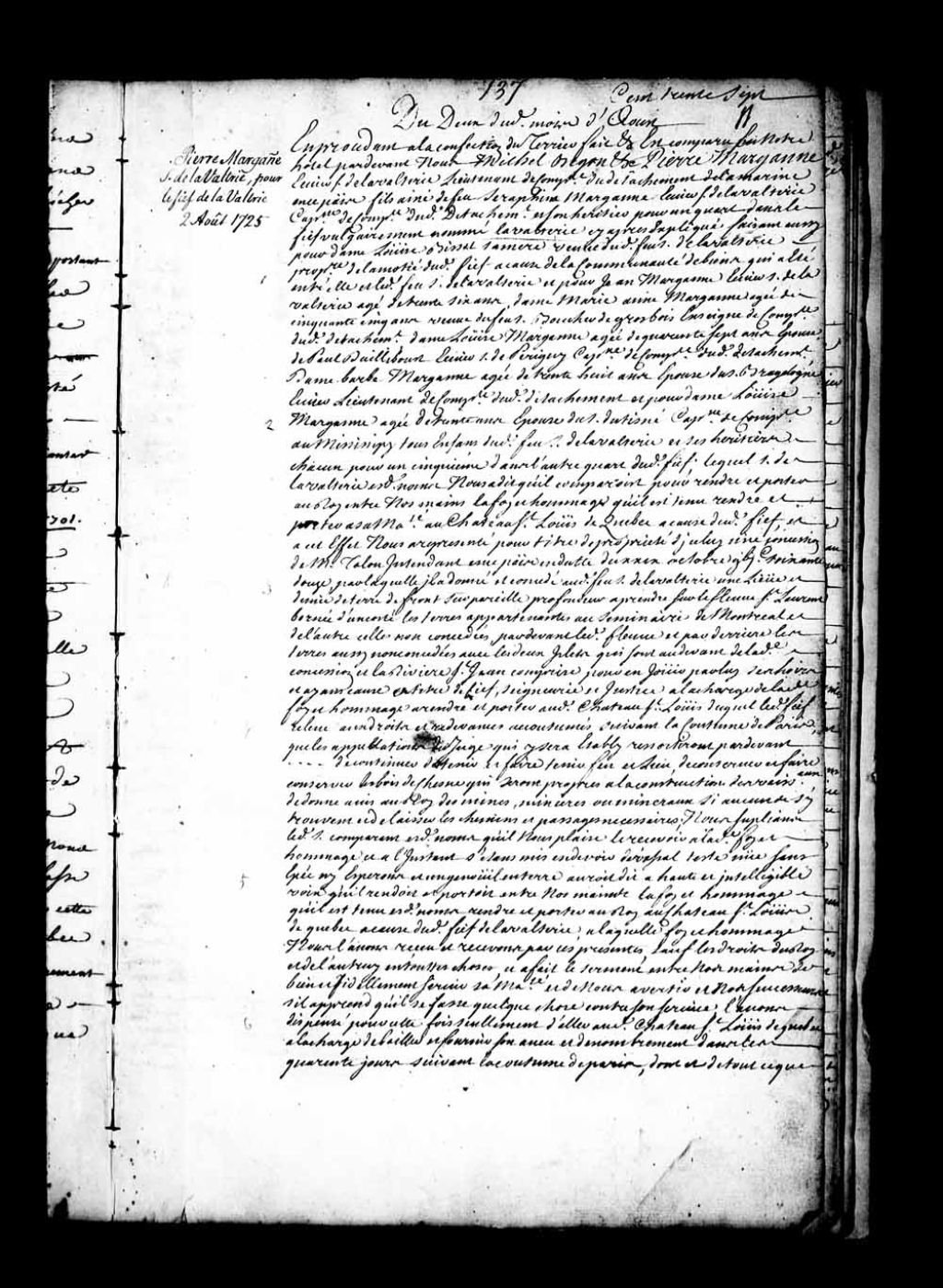 Acte de foi et hommage de Pierre Marganne (Margane), écuyer, sieur de Lavaltrie, lieutenant d'une compagnie du détachement de la Marine en Nouvelle-France, fils aîné de feu Séraphin Marganne, de son vivant écuyer, sieur de Lavaltrie et capitaine d'une compagnie du détachement de la Marine en Nouvelle-France, héritier pour un quart dans la seigneurie de Lavaltrie, faisant aussi pour Louise Bissot, sa mère, propriétaire de la moitié de ladite seigneurie, et pour ses frères et soeurs, héritiers pour chacun un cinquième dans l'autre quart de ladite seigneurie, lequel acte de foi et hommage étant fait pour ledit fief de Lavaltrie