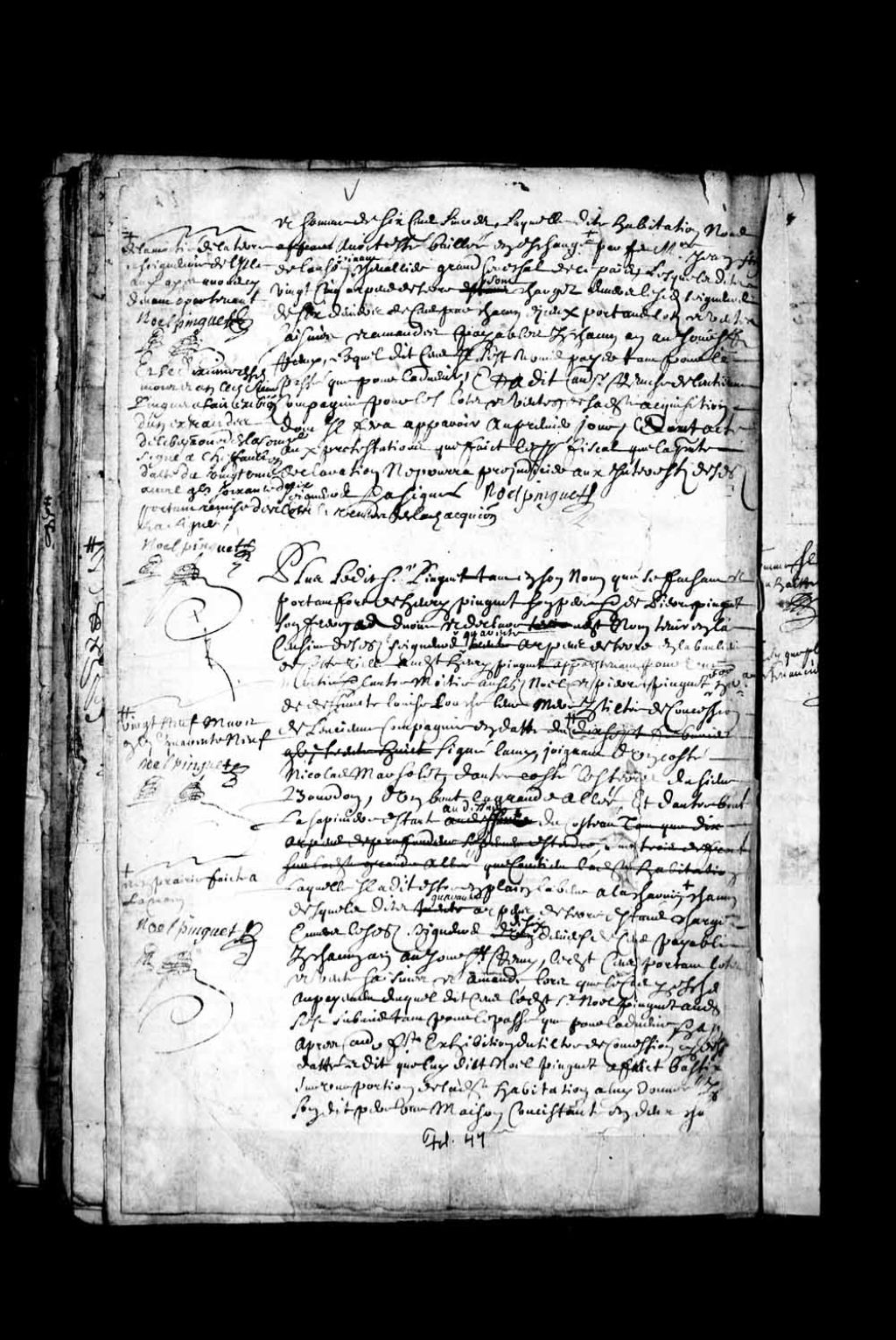 - Transcription du texte avec orthographe modernisée : «Plus le dit Sieur Pinguet tant en son nom que se faisant et portant fort de Henri Pinguet son père et de Pierre Pinguet son frère avoue et déclare par-devant Nous tenir en la censive de ses seigneurs quarante arpents de terre en la banlieue de cette ville au dit Henri Pinguet appartenant pour une moitié et l'autre moitié au Sieurs Noël et Pierre Pinguet cohéritiers, de défunte Louise Loushe(Lousche) leur mère et titre de concession de l'ancienne Compagnie en date du vingt-neuf mars mille sept cent quarante-neuf signé Lamy, joignant d'un côté Nicolas Marsolet, d'autre côté les terres du Sieur Bourdon, d'un bout la grande Allée, et d'autre bout la sapinière étant au-dessus du Coteau laquelle il a dit être en plein labour à la charrue et en prairie fait à la main chacun desquels dit quarante arpents de terre étant chargés envers les dits seigneurs de six deniers de cens payables par chacun an au jour Saint-Rémi, le dit cent portant lods et ventes, saisines et amende, lors que le cens (...) au payement duquel dit cens ledit Sieur Noël Pinguet au dit (...) s'est soumis tant pour le passé que pour l'avenir et après avoir fait exhibition du titre de concession ci-dessus daté. Et dit que lui dit Noël Pinguet a fait bâtir sur une portion de la dite habitation à lui donnée par son dit père une maison consistant en deux chambres à eau et grenier, une grange et une étable avec cours jardin clos de pieux dont acte. Noël Pinguet L. T. Chartier Peuvret (en marge est écrit : (...) ... Et ce dixième jours mois et an le dit (...) Pinguet a fait exhibition d'un extrait des délibérations de la Compagnie signé A Cheffaut (Antoine Cheffault sieur de la Renardière) en date du vingtième avril mille sept cent soixante-deux portant remise des lods et ventes de la dite acquisition et a signé. Noël Pinguet»