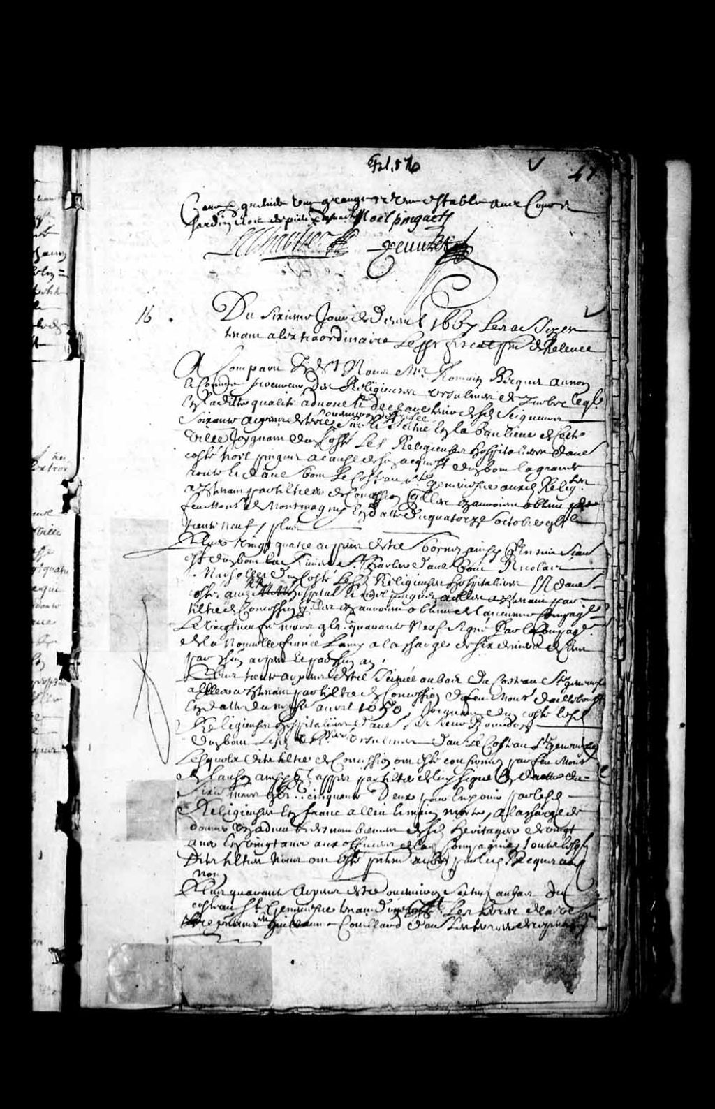 - Transcription du texte avec orthographe modernisée : «Du sixième jour de décembre 1667, les assises tenant à l'extraordinaire, le procureur fiscal présent de relevée. A comparu par-devant nous Maître Romain Becquet, au nom et comme procureur des religieuses Ursulines de Québec, lequel en la dite qualité avoue et déclare tenir des dits seigneurs soixante arpents de terre ou environ défrichés situés en la banlieue de cette ville, joignant d'un côté les religieuses hospitalières, d'autre côté Noël Pinguet à cause de son acquêt, d'un bout la grande route, et d'autre bout le coteau Sainte-Geneviève, aux dites religieuses appartenant par titre de concession qu'elles en auraient obtenu de feu Monsieur de Montmagny, en date du quatorze octobre mille six cent trente-neuf. Plus, vingt-quatre arpents de terre bornés ainsi qu'il ensuit savoir, d'un bout la rivière Saint-Charles, d'autre bout Nicolas Marsolet, d'un côté les dites religieuses [...]