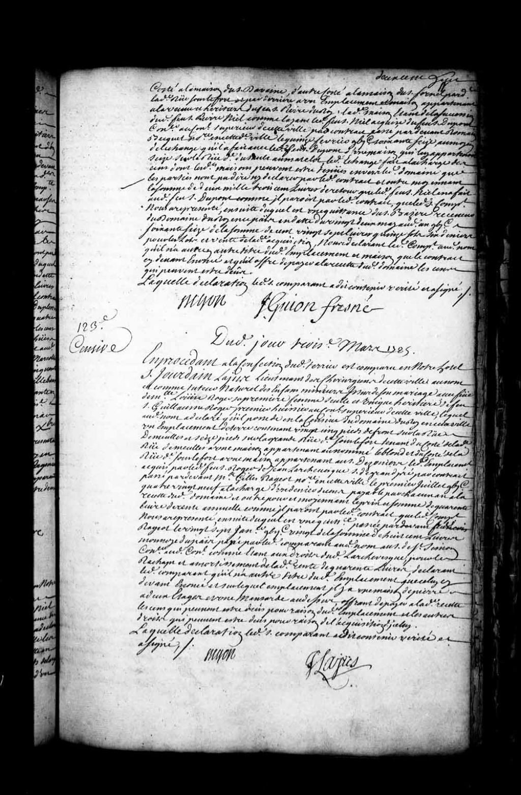 Déclaration du sieur Jourdain (Jordain) Lajus, lieutenant des chirurgiens de Québec, au nom et comme tuteur naturel des enfants mineurs issus de son mariage avec feu dame Louise Roger, sa première femme, quant à l'emplacement de terre qu'il détient dans la censive du Domaine du Roi, lequel emplacement étant sis rue De Meulles en la Basse-Ville de Québec