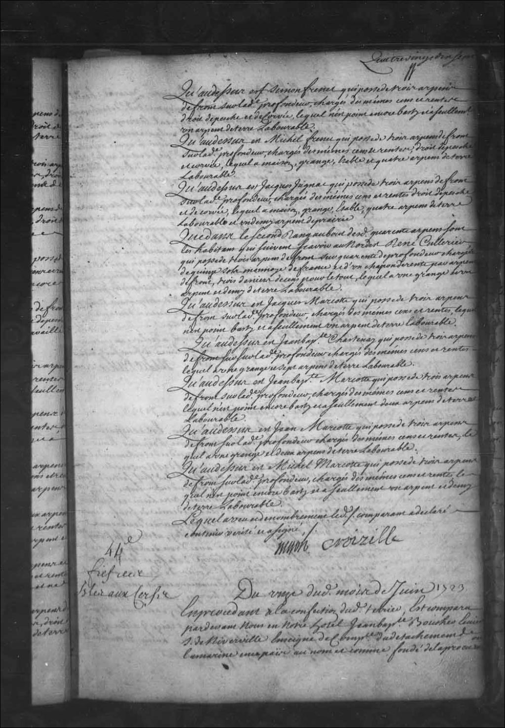 Aveu et dénombrement de Jean-Baptiste Boucher, écuyer, sieur de Niverville, enseigne d'une compagnie du détachement de la Marine en Nouvelle-France, au nom et comme fondé de la procuration de François-Zacharie Hertel, écuyer, sieur de Lafrenière (La Fresnière), lieutenant d'une compagnie dudit détachement, pour le fief vulgairement nommé l'île aux Cerfs