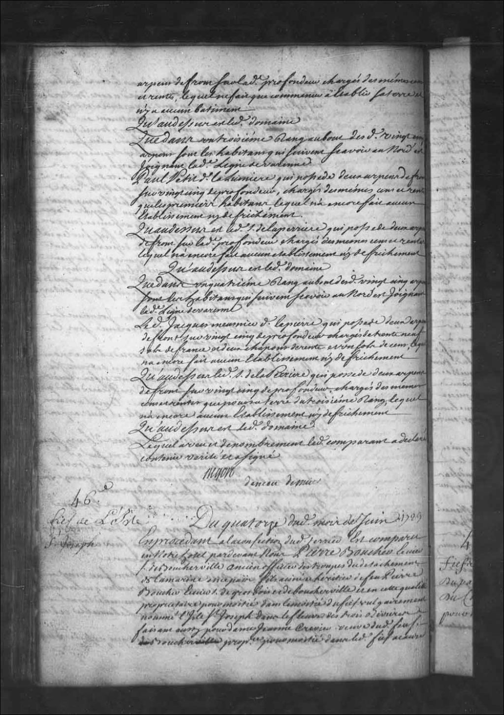 Aveu et dénombrement de Pierre Boucher, écuyer, sieur de Boucherville, ancien officier des troupes du détachement de la Marine en Nouvelle-France, fils aîné et héritier de feu Pierre Boucher, de son vivant écuyer, sieur de Grosbois et de Boucherville, pour la moitié du fief vulgairement nommé l'île Saint-Joseph, 14 juin 1723, Archives nationales à Québec, Fonds Intendants, (03Q,E1,S4,SS3,P46).
