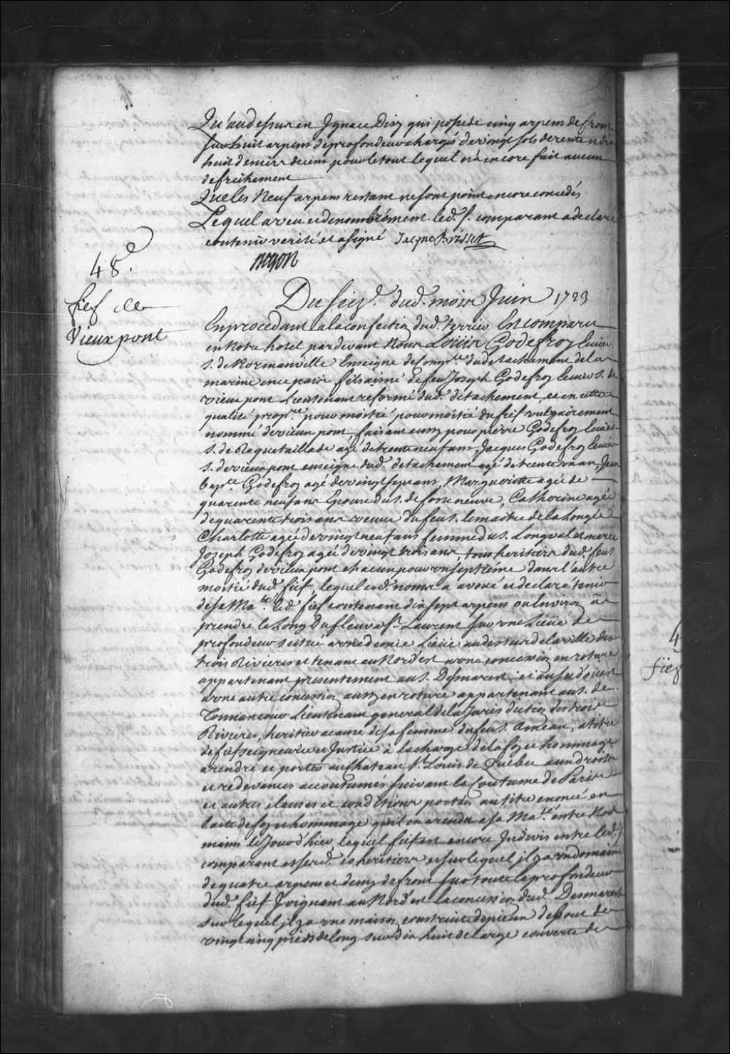 Aveu et dénombrement de Louis Godefroy, écuyer, sieur de Normanville, enseigne d'une compagnie du détachement de la Marine en Nouvelle-France, fils aîné de feu Joseph Godefroi (Godefroy), de son vivant écuyer, sieur du Vieuxpont et lieutenant réformé dudit détachement, pour le fief vulgairement nommé du Vieuxpont, 16 juin 1723, Archives nationales à Québec, Fonds Intendants, (03Q,E1,S4,SS3,P48).