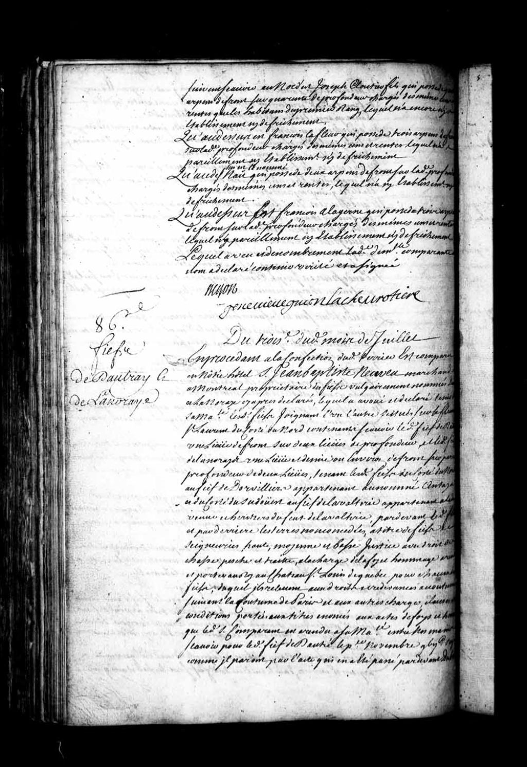 Aveu et dénombrement du sieur Jean-Baptiste Neveu, marchand de Montréal, pour le fief de Dautray (Dautré) et de Lanoraye (Lanoraie), 3 juillet 1724, Archives nationales à Québec, Fonds Intendants, (03Q,E1,S4,SS3,P86).