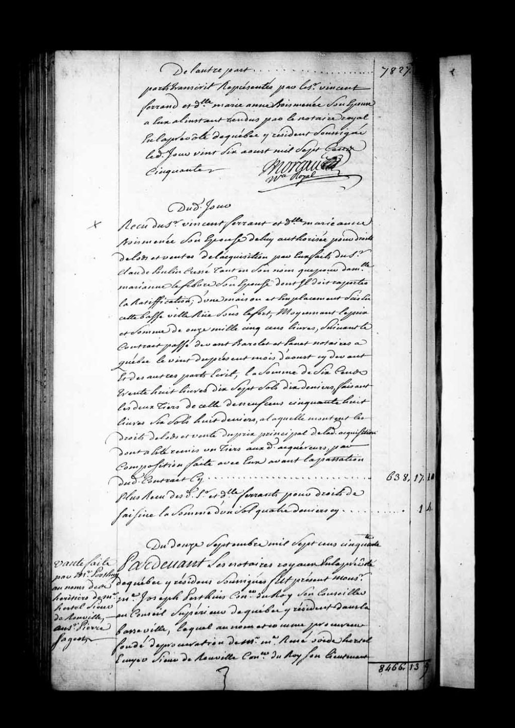 Contrat de vente par Maître Joseph Perthuis, Conseiller du Roi et Son Conseiller au Conseil supérieur de Québec, résidant en la Basse-Ville de Québec, au nom et comme procureur de Maître René-Ovide Hertel, écuyer, Sieur de Rouville, Conseiller du Roi et Son lieutenant général en la juridiction royale des Trois-Rivières, lui-même agissant tant en son nom que comme ayant les droits cédés de Louis-Antoine Hertel, écuyer, Sieur de Rouville, son frère, officier dans les troupes du détachement de la Marine entretenues par Sa Majesté en Nouvelle-France, comme procureur de Michel Hertel, écuyer, Sieur de Rouville, officier dans les troupes du détachement de la Marine entretenues par Sa Majesté en Louisiane, et de Charles Boucher, écuyer, Sieur de Grosbois, comme ayant épousé Damoiselle Thérèse de Rouville, demeurant à Boucherville, ses frères et beau-frère, et aussi comme procureur de Dame Marie-Anne Legras, épouse et procureure de Jean-Baptiste Hertel, écuyer, Sieur de Rouville, son frère, lieutenant d'une compagnie des troupes du détachement de la Marine, tous héritiers pour un cinquième du défunt Jean-Baptiste Hertel, écuyer, Sieur de Rouville, Chevalier de l'Ordre royal et militaire de Saint-Louis, de son vivant capitaine d'une compagnie du détachement de la Marine, et Dame Marie-Anne Beaudouin (Baudouin;Beaudoin), son épouse, leur père et mère, au Sieur Pierre Sageot (Sajeau), négociant, demeurant rue Sur le quai à Québec, d'un emplacement et d'une maison de pierre et de bois sis rue sous l'Escalier au-dessous du fort en la Basse-Ville de Québec (Notaires Jean-Antoine Saillant de Collégien et Paul-Antoine-François Lanouiller Desgranges )