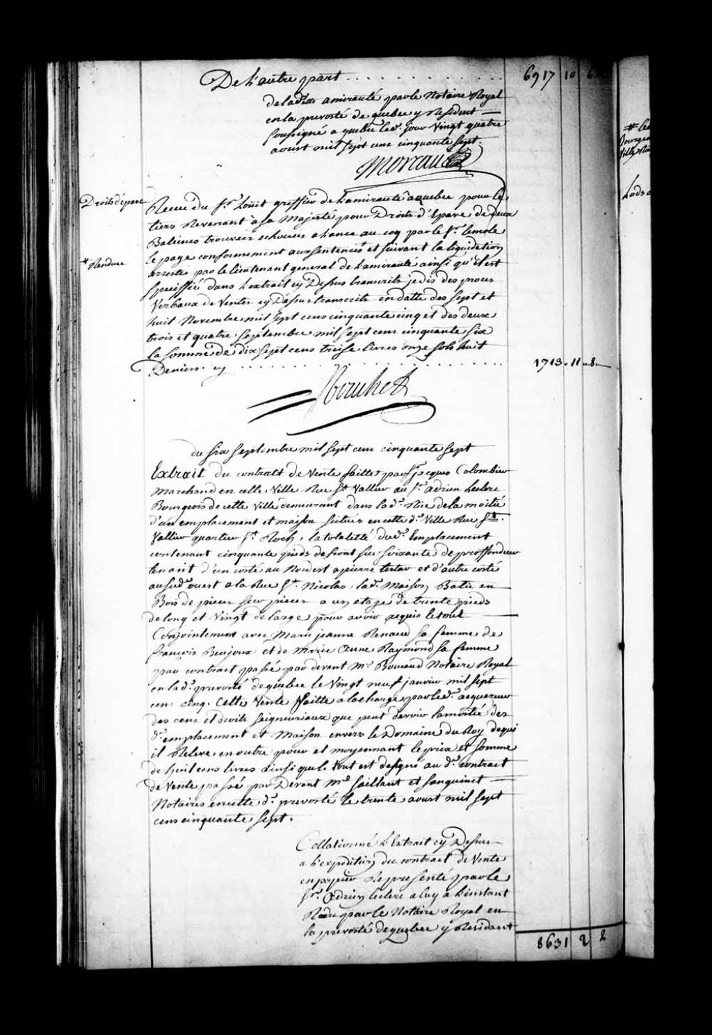 Reçu du Sieur Louet, greffier de l'Amirauté de Québec, pour la part du produit de la vente de l'huile et des brins (fanons) de baleine revenant à Sa Majesté pour droits d'épave