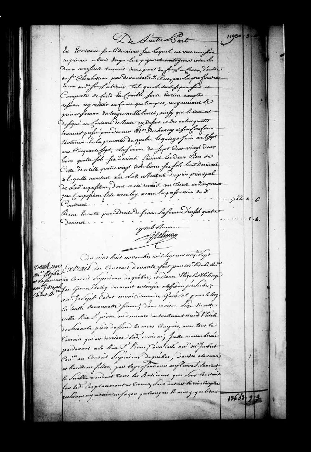 Extrait du contrat de vente par Monsieur Estebe, Conseiller au Conseil supérieur de Québec, et Dame Élisabeth Thibierge (Tibierge), son épouse, demeurant rue Saint-Pierre à Québec, à Monsieur Joseph Cadet, munitionnaire général pour le Roi en toute la Nouvelle-France, d'un emplacement, d'une maison et des bâtiments sis rue Saint-Pierre à Québec (Notaires Jean-Claude Panet et Claude Barolet)