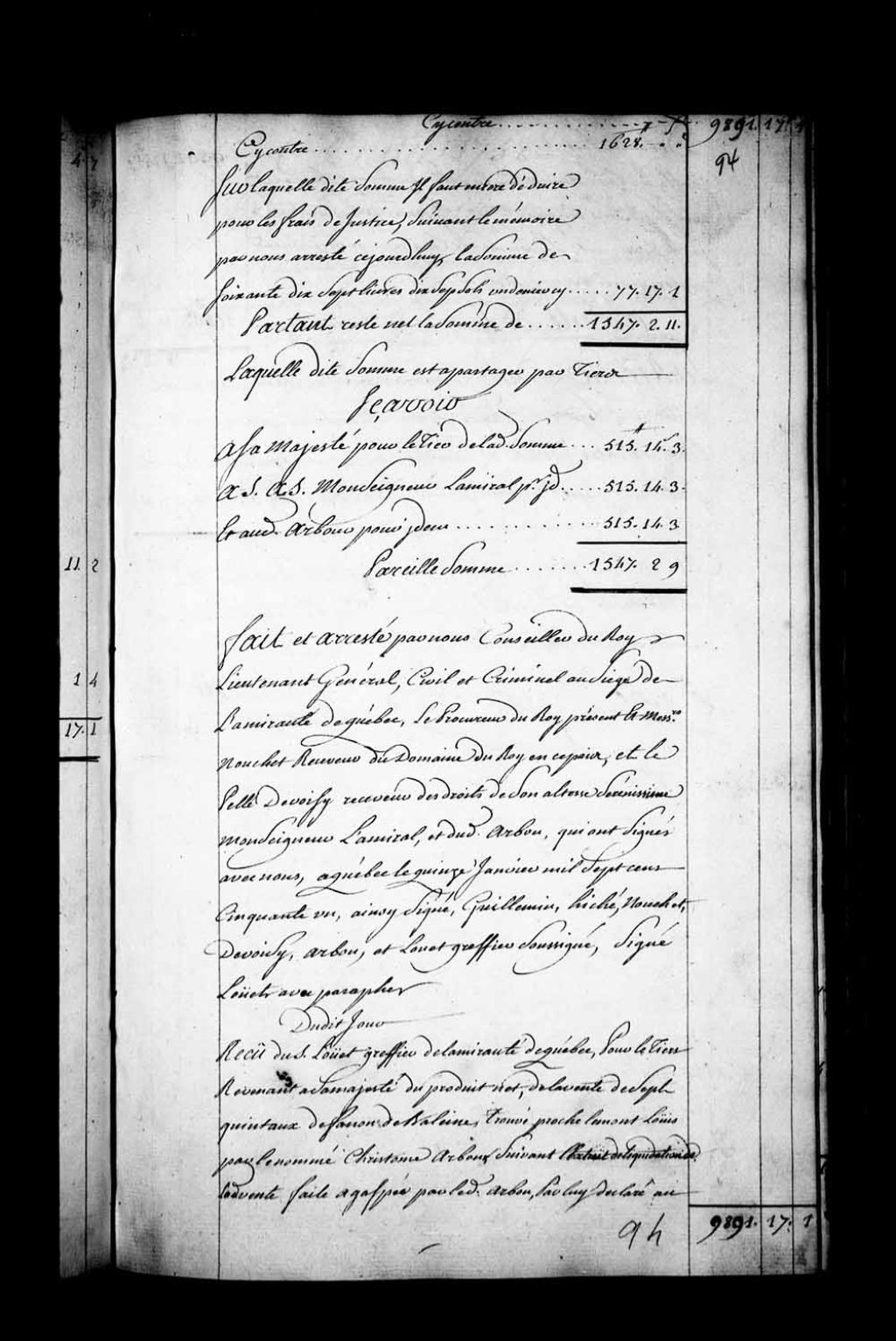 Reçu du Sieur Louet, greffier de l'Amirauté de Québec, pour la part du produit de la vente des fanons revenant à Sa Majesté pour droits d'épave, 15 janvier 1751, Archives nationales à Québec, Fonds Intendants, (03Q,E1,S4,SS4,D37,P2).