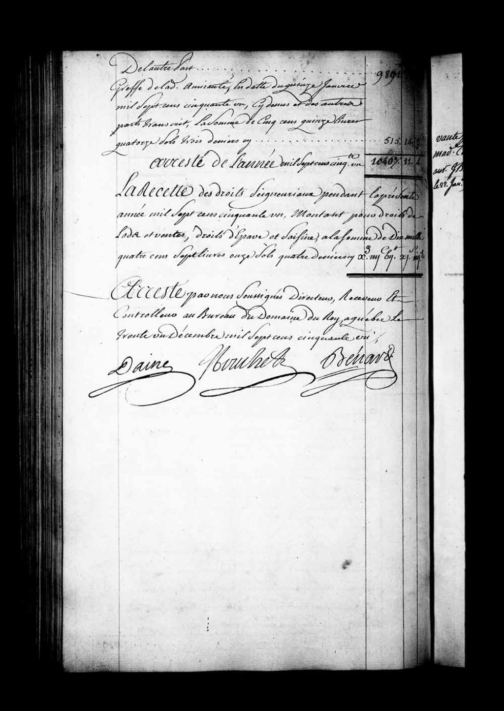Conclusion comptable de l'année 1751 quant aux diverses redevances versées au Domaine du Roi en ladite année et authentification par le directeur, le receveur et le contrôleur au Bureau du Domaine