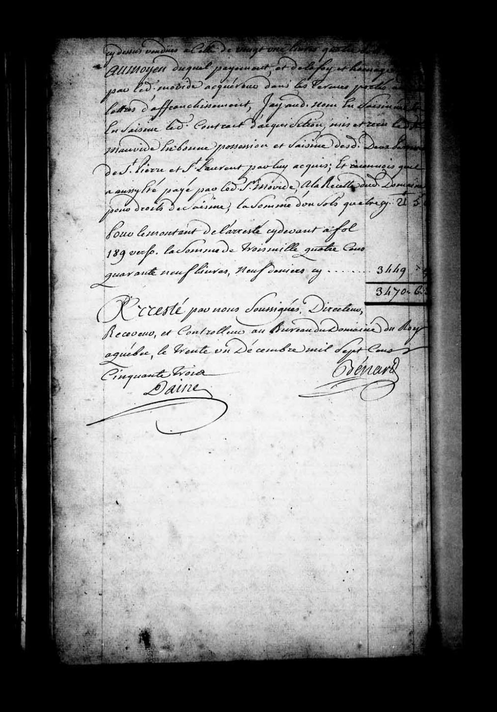 Ajout ultérieur à la conclusion comptable de l'année 1753, suite à une omission, quant aux diverses redevances versées au Domaine du Roi en ladite année et nouvelle authentification par le directeur, le receveur et le contrôleur au Bureau du Domaine, 31 décembre 1753, Archives nationales à Québec, Fonds Intendants, (03Q,E1,S4,SS4,D75,P5).