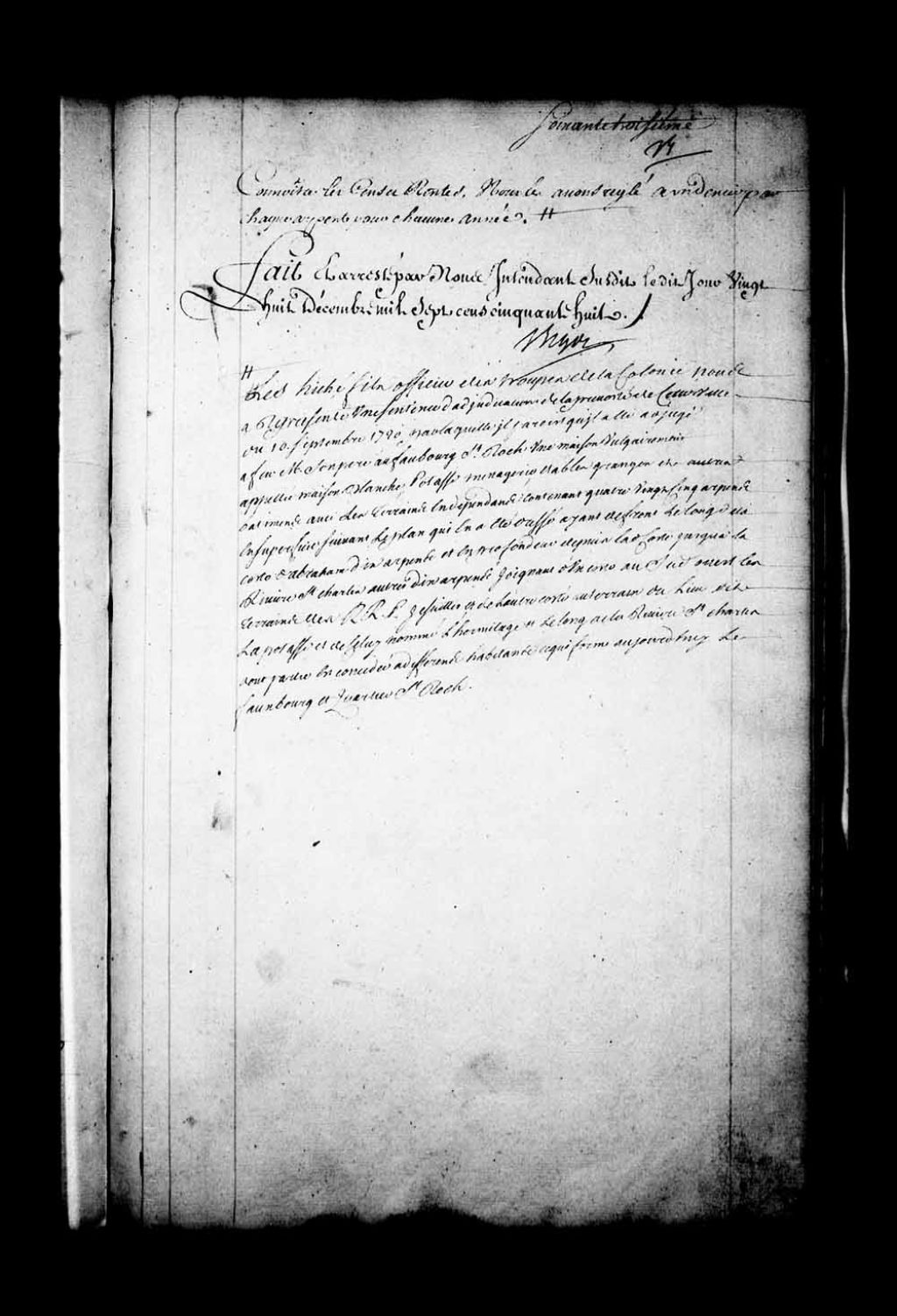 Déclaration du Sieur Hiché fils, officier des troupes de la Colonie, quant à une maison vulgairement appelée Maison Blanche, avec la Potasse, la ménagerie, l'étable, les granges et autres bâtiments, ainsi que les terrains en dépendant, sise au faubourg Saint-Roch de Québec