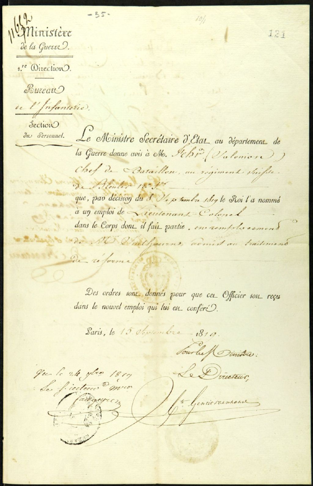 - Le ministre secrétaire d'État au département de la guerre donne avis à Salomon Fehr, chef du bataillon au régiment suisse de Bleuber, que, par décision du 8 septembre 1819, le Roi l'a nommé à un emploi de lieutenant colonel dans le corps dont il fait partie