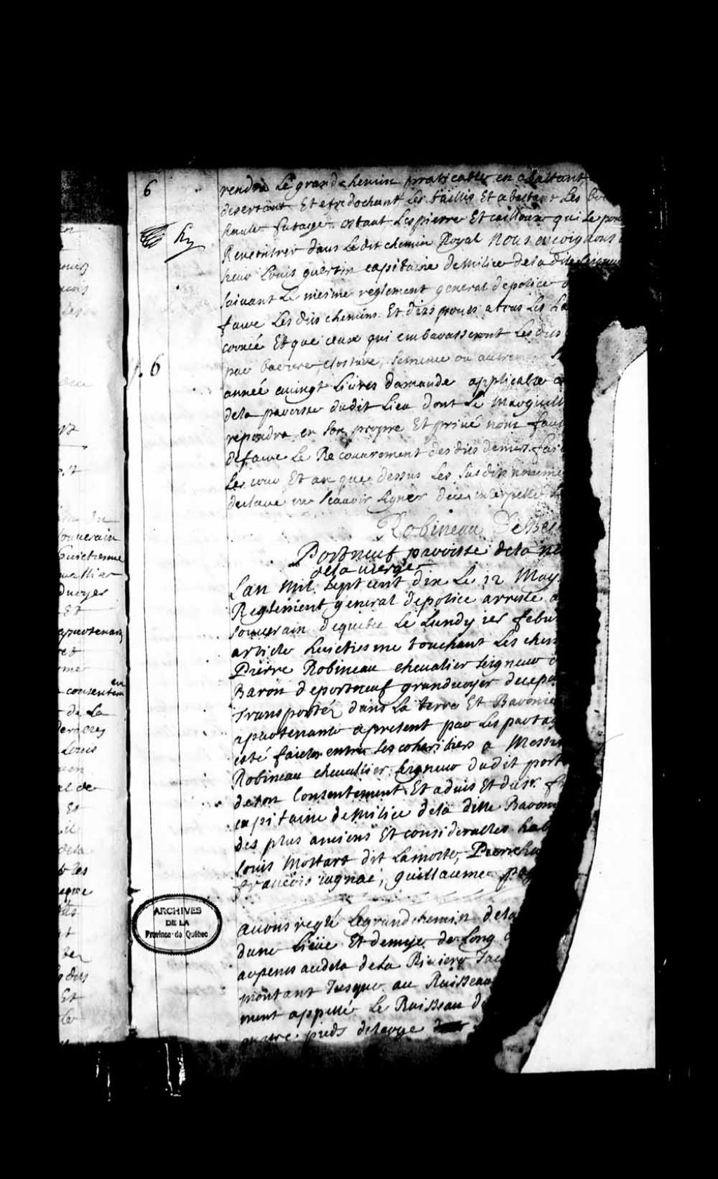 Procès-verbal de Pierre Robineau de Bécancour pour le grand chemin de la terre et baronnie de Portneuf appartenant à présent, par les partages qui en ont été faits entre les cohéritiers, à messire Robineau, chevalier, seigneur du dit Portneuf