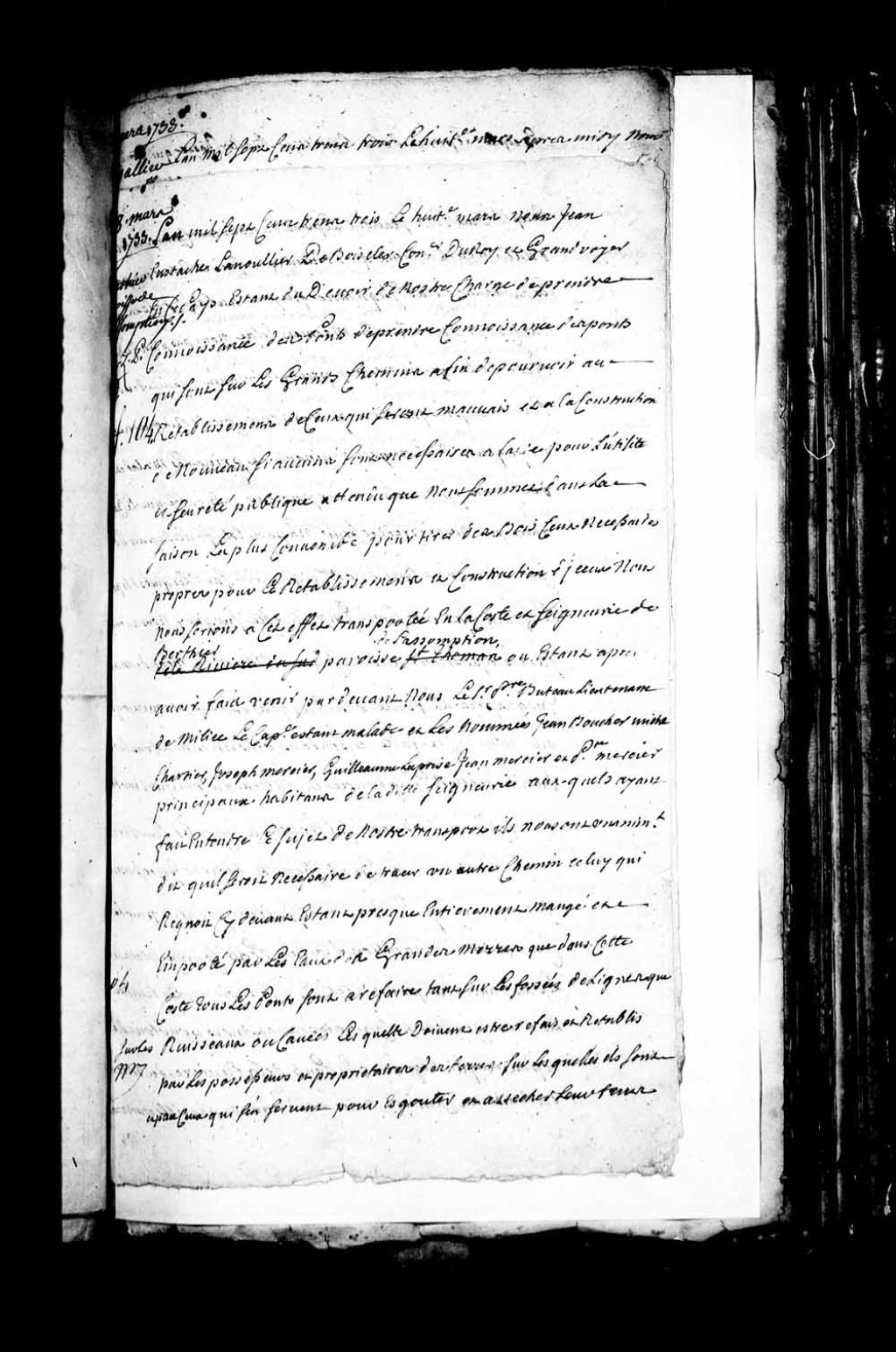 Procès-verbal de Jean-Eustache Lanouillier de Boiscler au sujet des ponts de la seigneurie de Berthier, paroisse de L'Assomption, 8 mars 1733, Archives nationales à Québec, Fonds Grands voyers, (03Q,E2,S1,D150,P139).