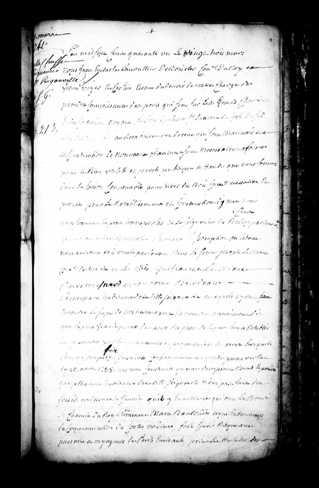 Procès-verbal de Jean-Eustache Lanouillier de Boiscler au sujet des chemins et ponts de la seigneurie de Bellechasse, paroisse de L'Assomption, appartenant à la veuve de Rigauville, 23 mars 1741, Archives nationales à Québec, Fonds Grands voyers, (03Q,E2,S1,D150,P188).
