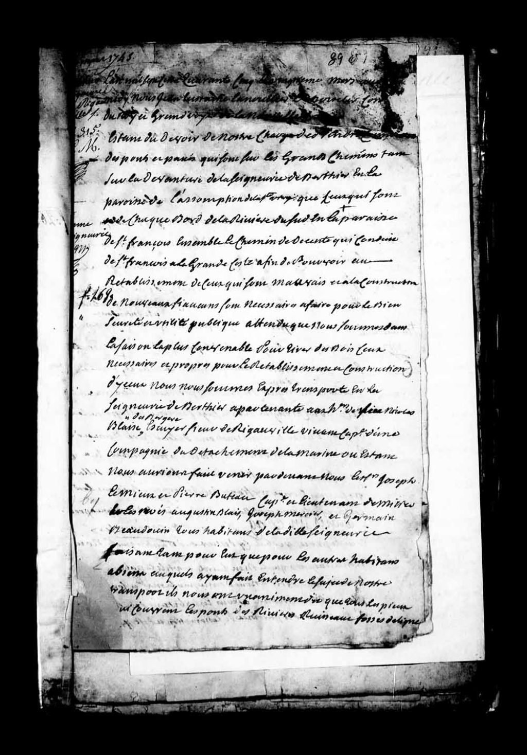Procès-verbal de Jean-Eustache Lanouillier de Boiscler au sujet de la réparation des ponts dans la seigneurie de Berthier, paroisse de L'Assomption de la Sainte-Vierge, 20 mars 1745, Archives nationales à Québec, Fonds Grands voyers, (03Q,E2,S1,D150,P336).