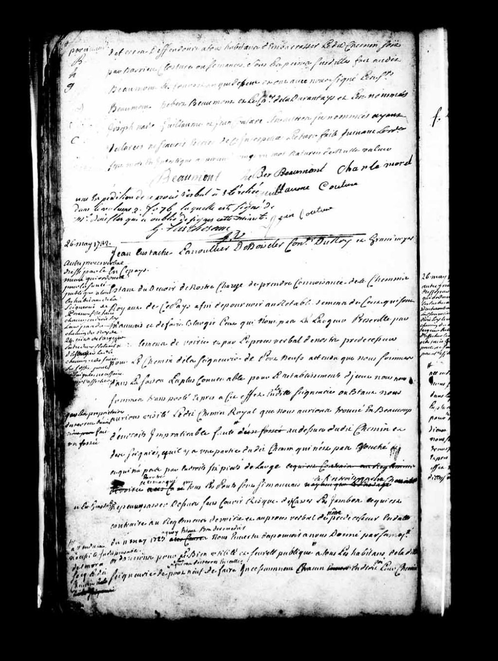Procès-verbal de Jean-Eustache Lanouillier de Boiscler qui ordonne, pour la sûreté publique, à tous les habitants de la seigneurie de Portneuf de faire chacun en droit soi leur part du chemin de Roi de vingt-quatre pieds de largeur entre deux clôtures, d'essoucher le dit chemin et de faire les fossés, ponts et saignées nécessaires pour l'assécher, 26 mai 1732, Archives nationales à Québec, Fonds Grands voyers, (03Q,E2,S1,D150,P435).