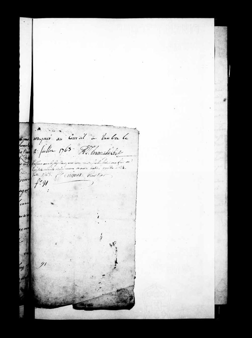 Note de de François-Joseph Cugnet disant qu'il faut se rendre sur les lieux pour répondre à la requête, 21 juillet 1763, Archives nationales à Québec, Fonds Grands voyers, (03Q,E2,S1,D152,P581).