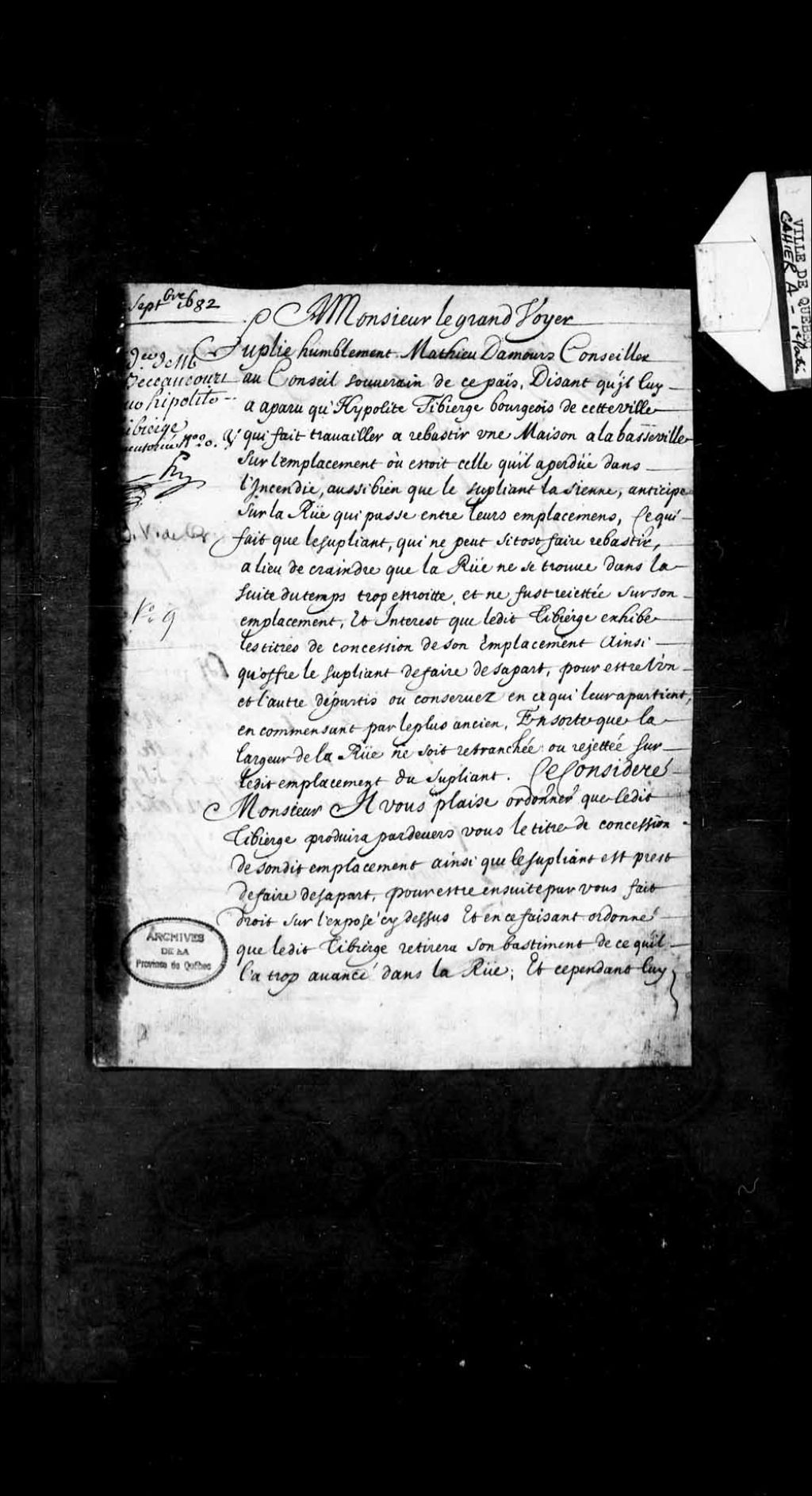 Procès-verbal de René Robineau de Bécancour qui, sur la dénonciation de Mathieu Damours, conseiller au Conseil Souverain, que son voisin Hypolite Thibierge, bourgeois, bâtit une maison à la basse ville de Québec qui anticipe sur la rue qui passe entre leurs emplacements pour, ensuite, se transporter sur les lieux avec le sieur Lerouge, arpenteur juré, 9 septembre 1682, Archives nationales à Québec, Fonds Grands voyers, (03Q,E2,S1,D150,P664).