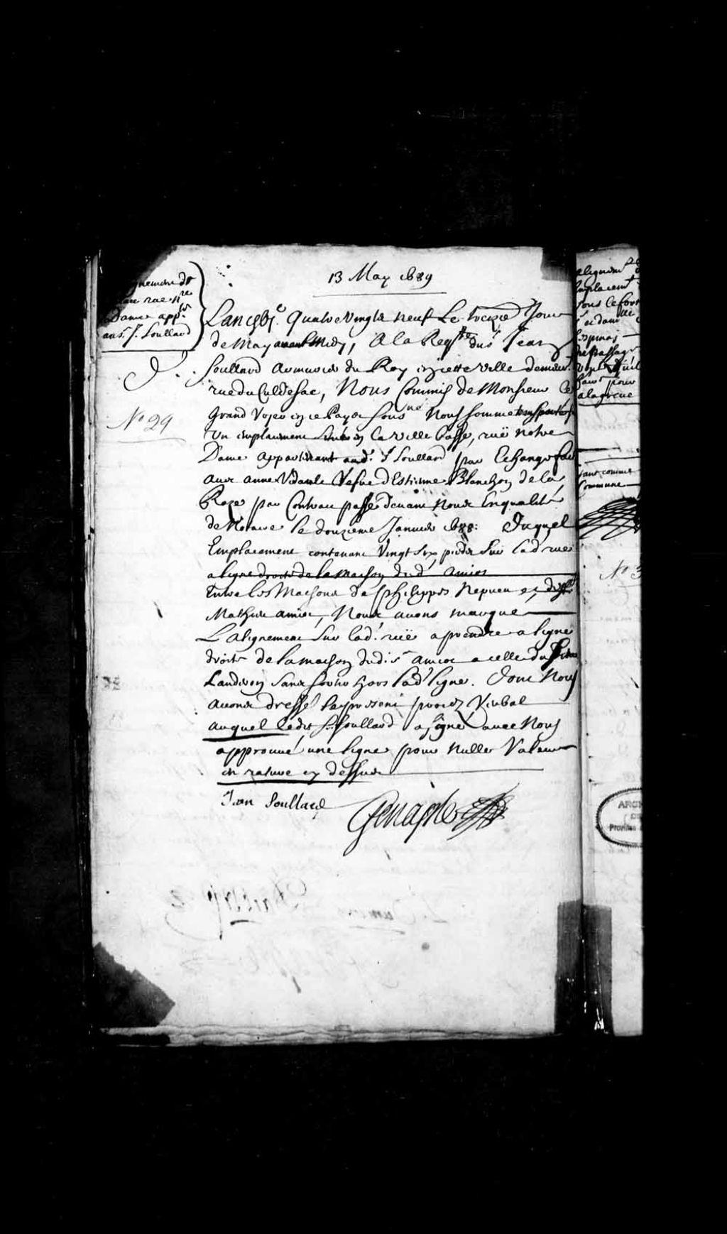 Procès-verbal d'alignement donné par François Genaple, commis à cet effet par le grand voyer, à Jean Soullard, armurier du Roi, pour un emplacement rue Notre-Dame, basse-ville de Québec, qu'il vient d'acquérir par échange fait avec Anne Vidault, veuve d'Etienne Blanchon dit la Roze