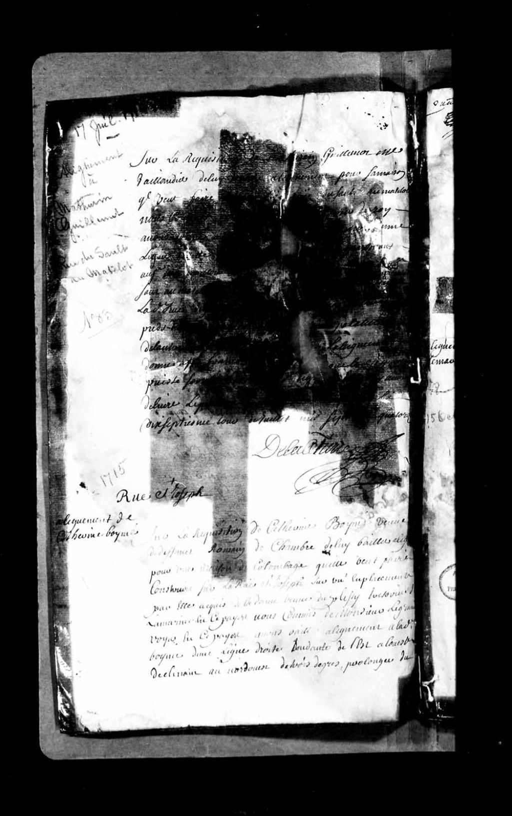 Procès-verbal d'alignement donné par Florent de Lacetière, commis à cet effet par le grand voyer, à Catherine Boyer, veuve de Romain de chambre, pour une maison qu'elle veut faire bâtir sur un emplacement qu'elle a acheté de la veuve Regnard Duplessis, rue Saint-Joseph, haute ville de Québec, 15 janvier 1715, Archives nationales à Québec, Fonds Grands voyers, (03Q,E2,S1,D150,P739).