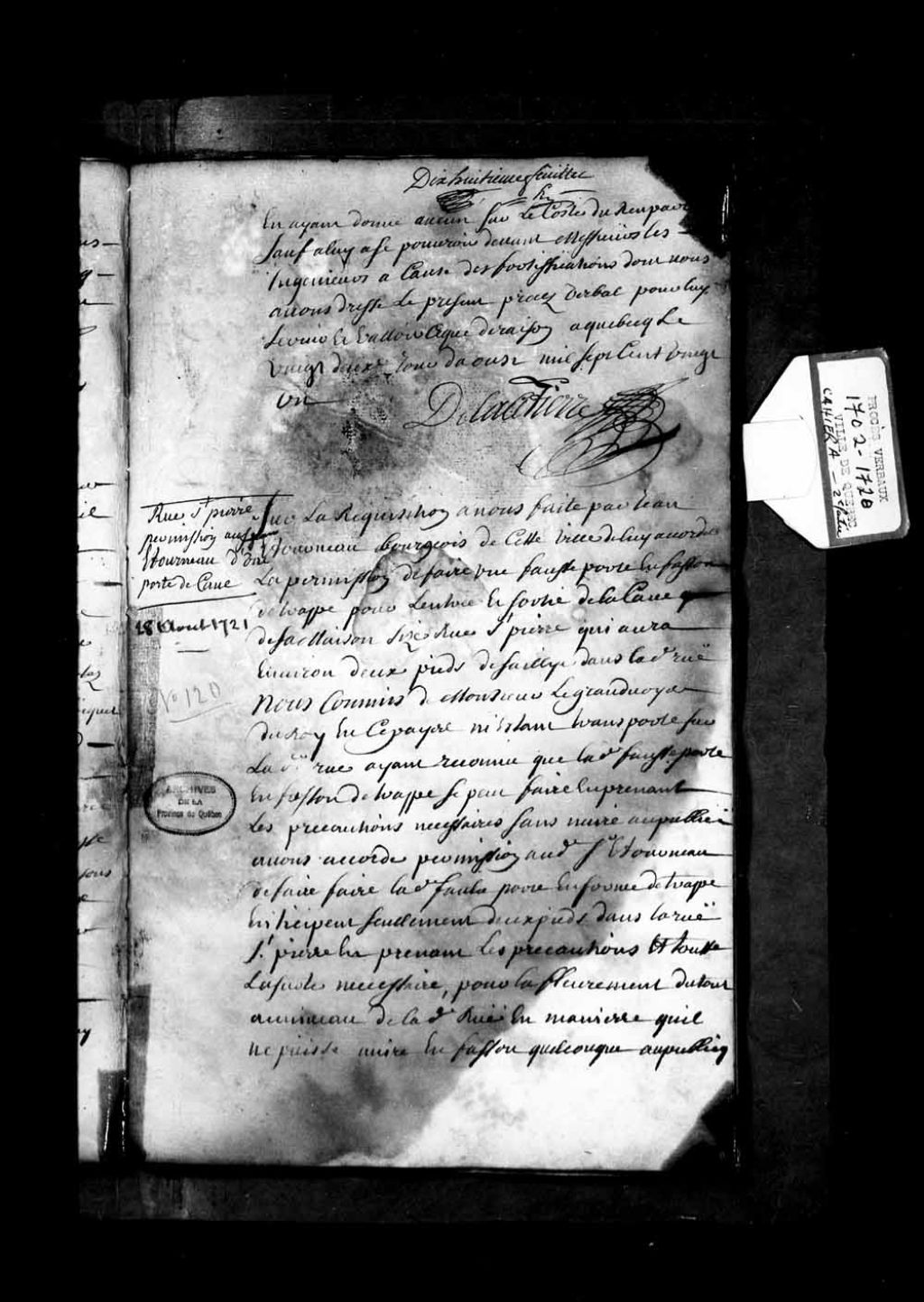 Procès-verbal de Florent de Lacetière, commis à cet effet par le grand voyer, à Jean Etourneau, bourgeois, pour faire une fausse porte en façon de trappe pour l'entrée et sortie de la cave de sa maison, rue Saint-Pierre, qui aura environ deux pieds de saillie dans la rue, 28 août 1721, Archives nationales à Québec, Fonds Grands voyers, (03Q,E2,S1,D150,P775).