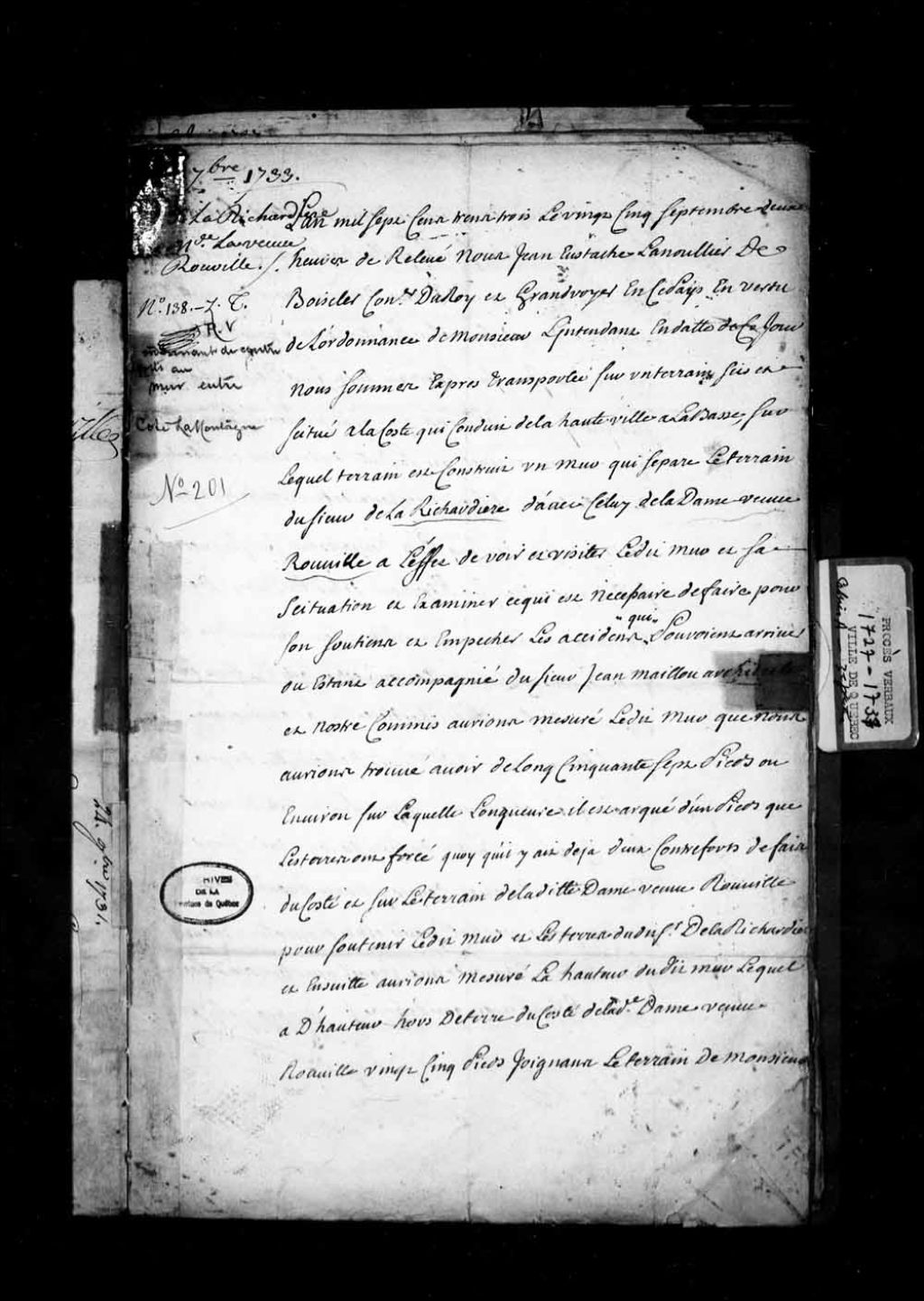 Procès-verbal de Jean-Eustache Lanouillier de Boiscler qui fixe que deux contre-forts de cinq pieds d'épaisseur sur six pieds de saillie devraient être faits pour soutenir le mur qui sépare les emplacements de M. de la Richardière et de madame veuve de Rouville, rue de la Montagne, et que ces travaux devraient être à la charge de M. de la Richardière, 25 septembre 1733, Archives nationales à Québec, Fonds Grands voyers, (03Q,E2,S1,D150,P857).