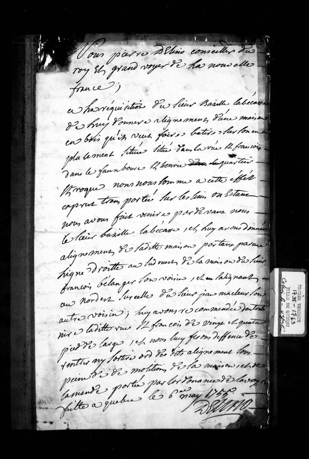 Procès-verbal d'alignement donné par Pierre Martin de Lino au Sieur Basile LaBécasse pour une maison en bois qu'il veut construire dans la rue Saint-François, faubourg Saint-Henri, quartier Saint-Roch, 6 mai 1755, Archives nationales à Québec, Fonds Grands voyers, (03Q,E2,S1,D150,P899).
