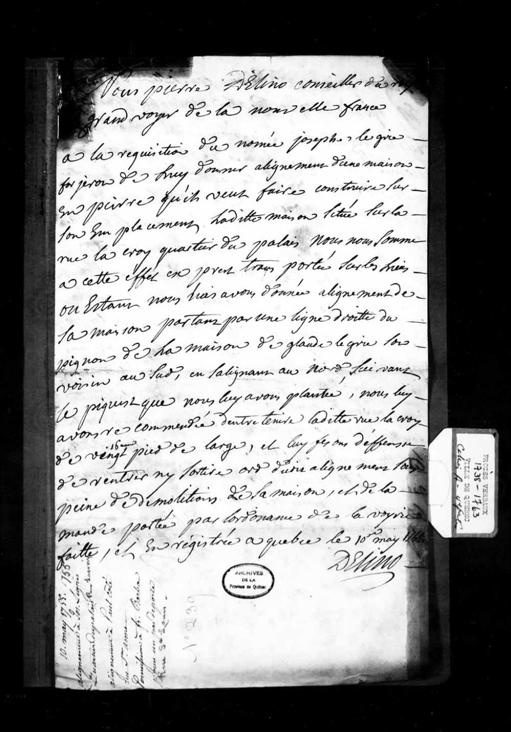 Procès-verbal d'alignement donné par Pierre Martin de Lino à Paul Côté pour la maison qu'il veut construire, rue Sainte-Anne