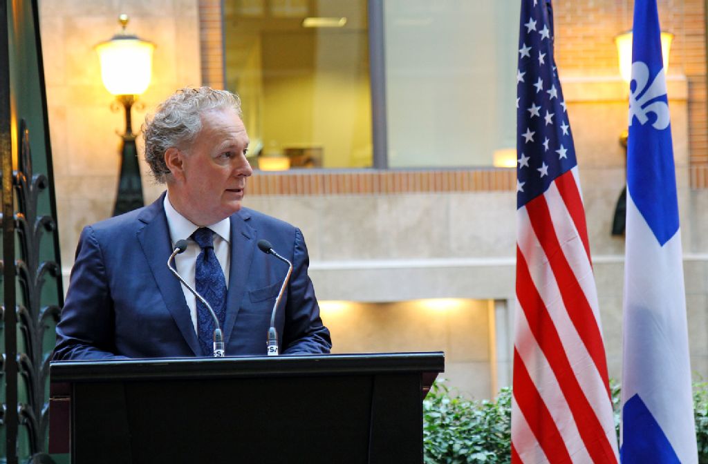 - Le premier ministre du Québec, monsieur Jean Charest et quelques membres de son cabinet dévoilent une plaque commémorative lors d'une cérémonie au centre de commerce mondial de Montréal en présence du consul général adjoint des États-Unis, monsieur Scott Boswell