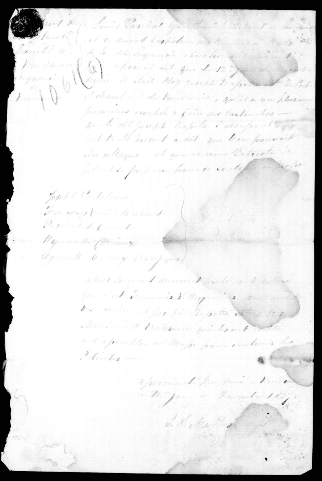 Déposition de Louis-Pascal Gauthier, de Vaudreuil, contre François-Xavier Desjardins et Joseph Rassette (Racette), maître de poste, 20 décembre 1837, Archives nationales à Québec, Fonds Ministère de la Justice, (03Q,E17,S37,D1061A).
