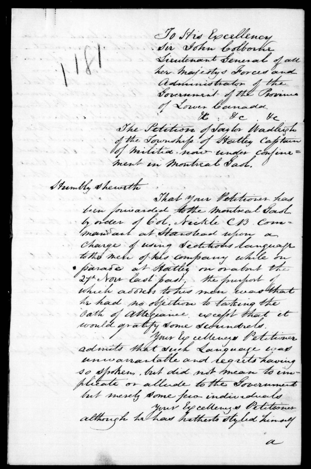 Pétition du capitaine Taylor Wadleigh, de Hatley, à sir John Colborne. Prison de Montréal