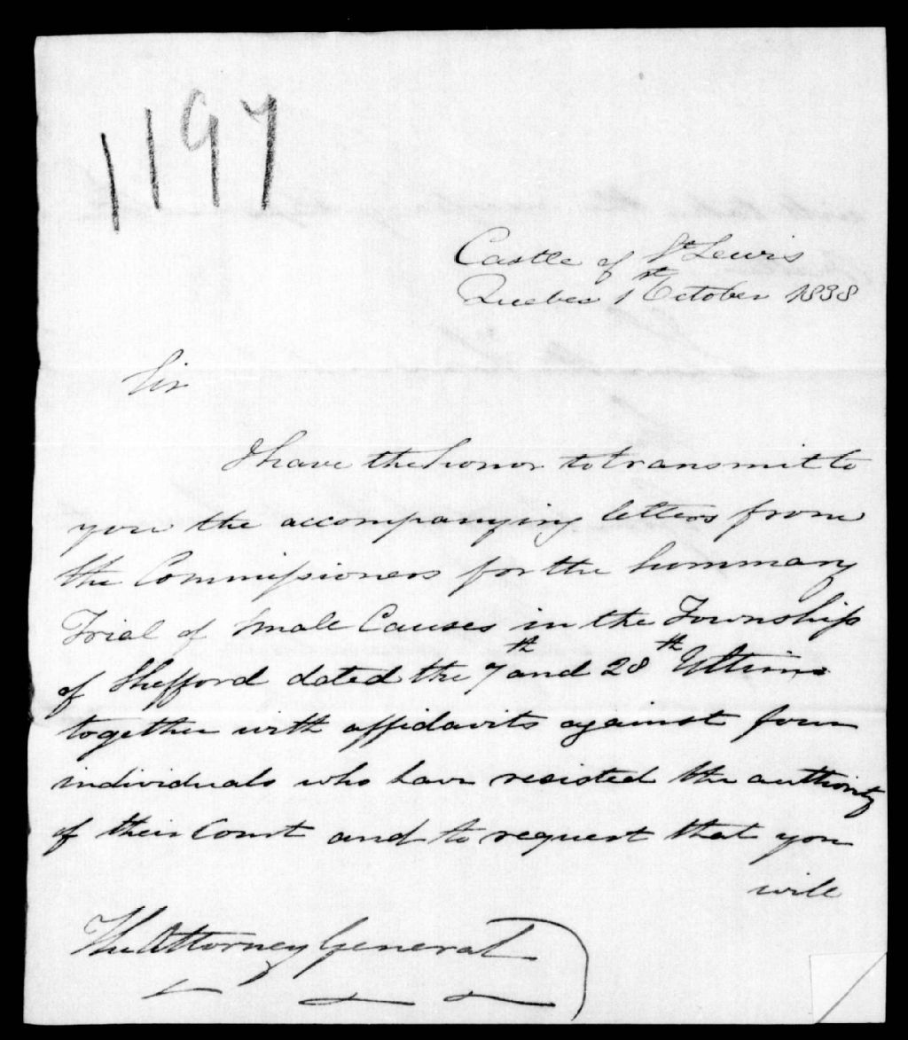 - Il lui envoie des pièces touchant le canton de Shefford. Ce dossier fait partie d'un ensemble de documents intitulé : Événements de 1838. Association des frères chasseurs et serment secret - Organisation de la rébellion