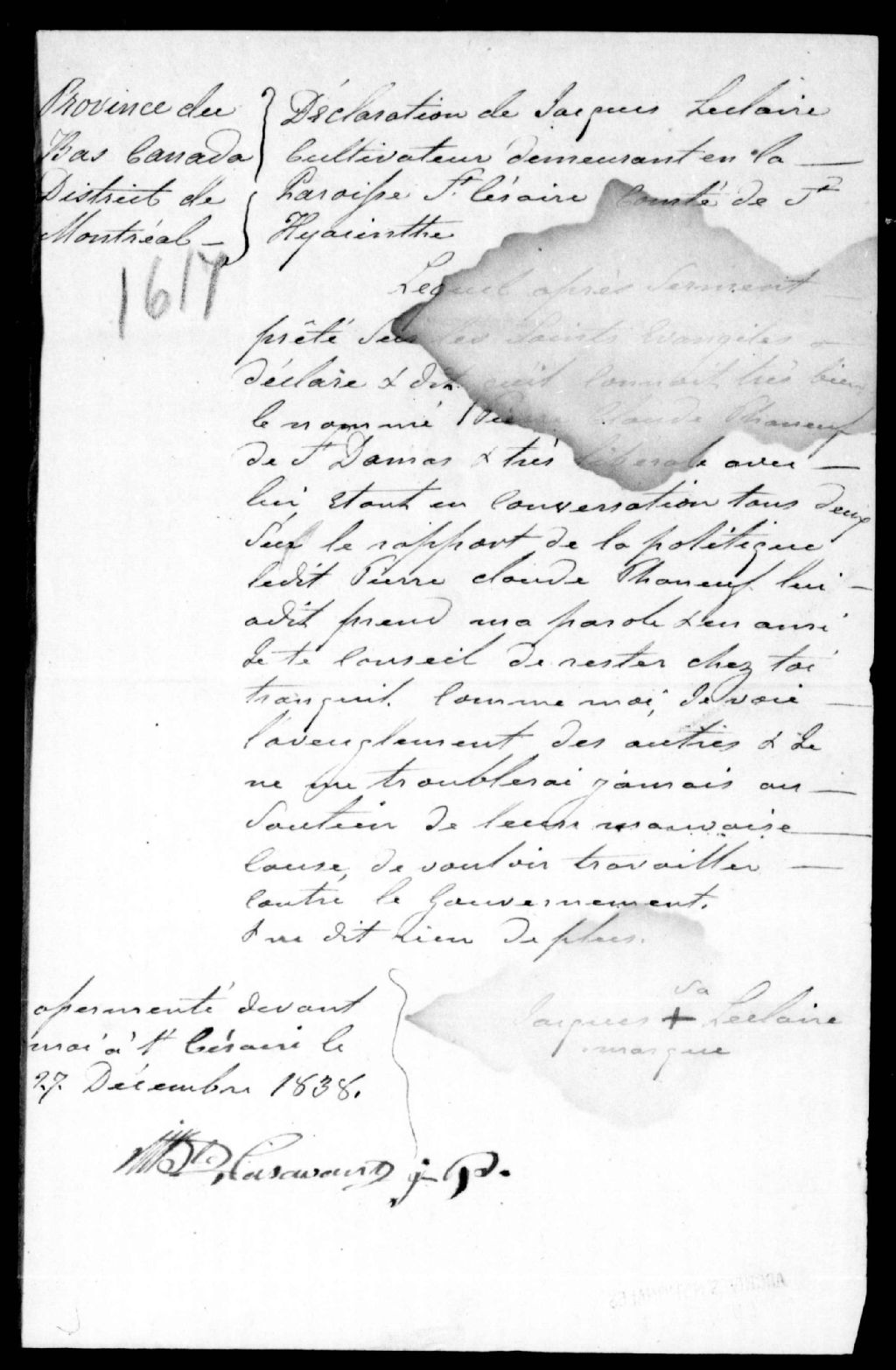 Déposition de Jacques Leclaire, cultivateur, de Saint-Césaire
