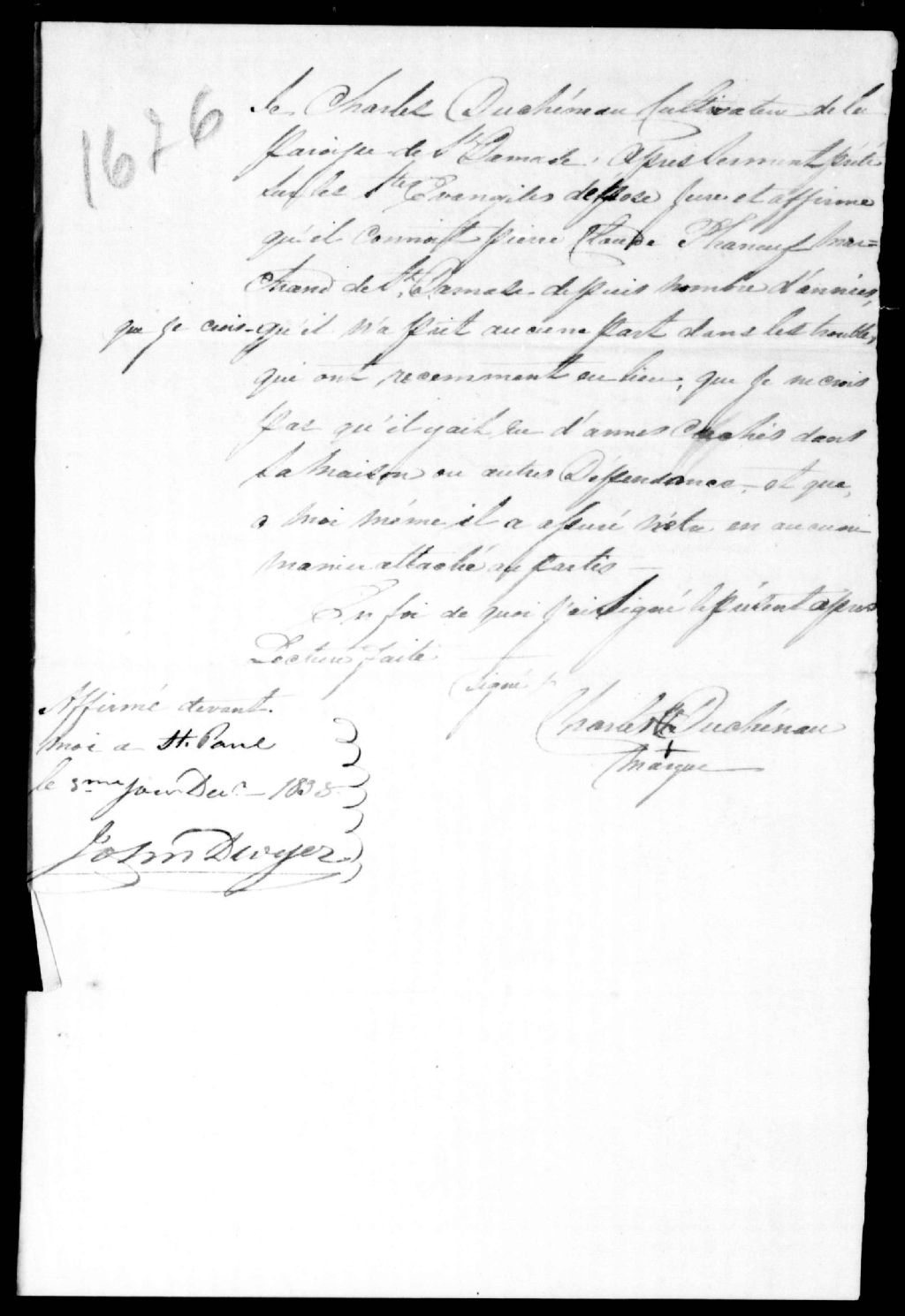 Déposition de Charles Duchesneau, cultivateur, de Saint-Damase, en faveur de Pierre-Claude Phaneuf, 8 décembre 1838, Archives nationales à Québec, Fonds Ministère de la Justice, (03Q,E17,S37,D1626).