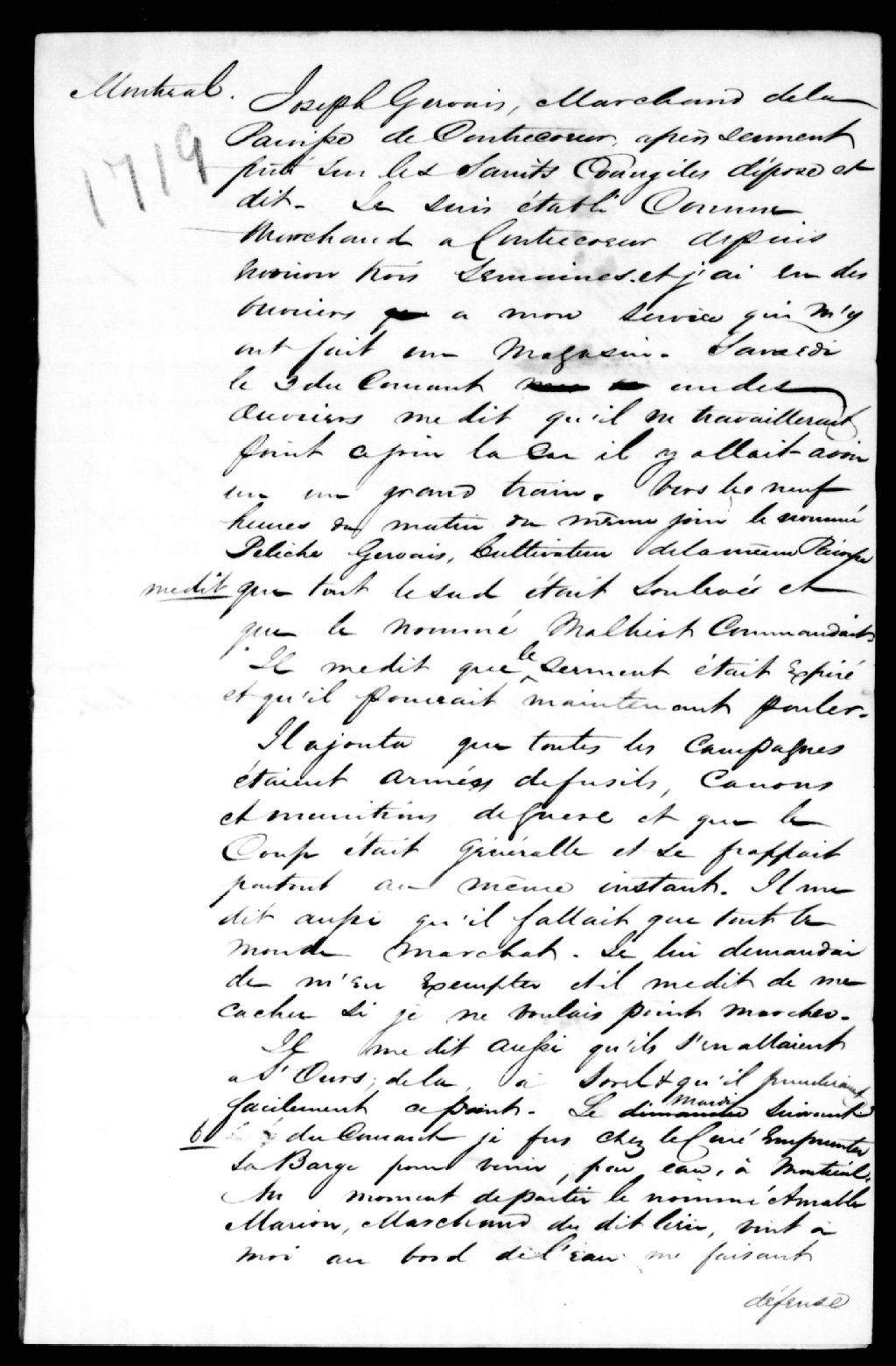 - Déposition de Joseph Gervais, marchand, de Contrecoeur, contre Amable Marion, marchand, de Contrcoeur, et Peliche Gervais, cultivateur, de Contrcoeur