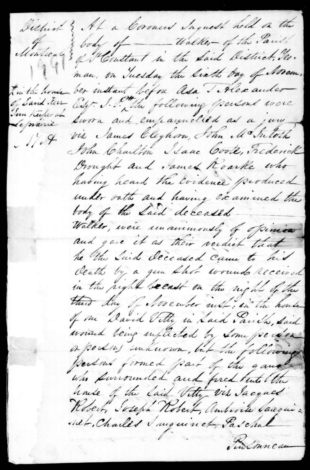 - Ce dossier fait partie d'un ensemble de documents intitulé : Assassinat d"Aaron Walker. La Tortue, Paroisse de Saint-Constant-de-la-Prairie