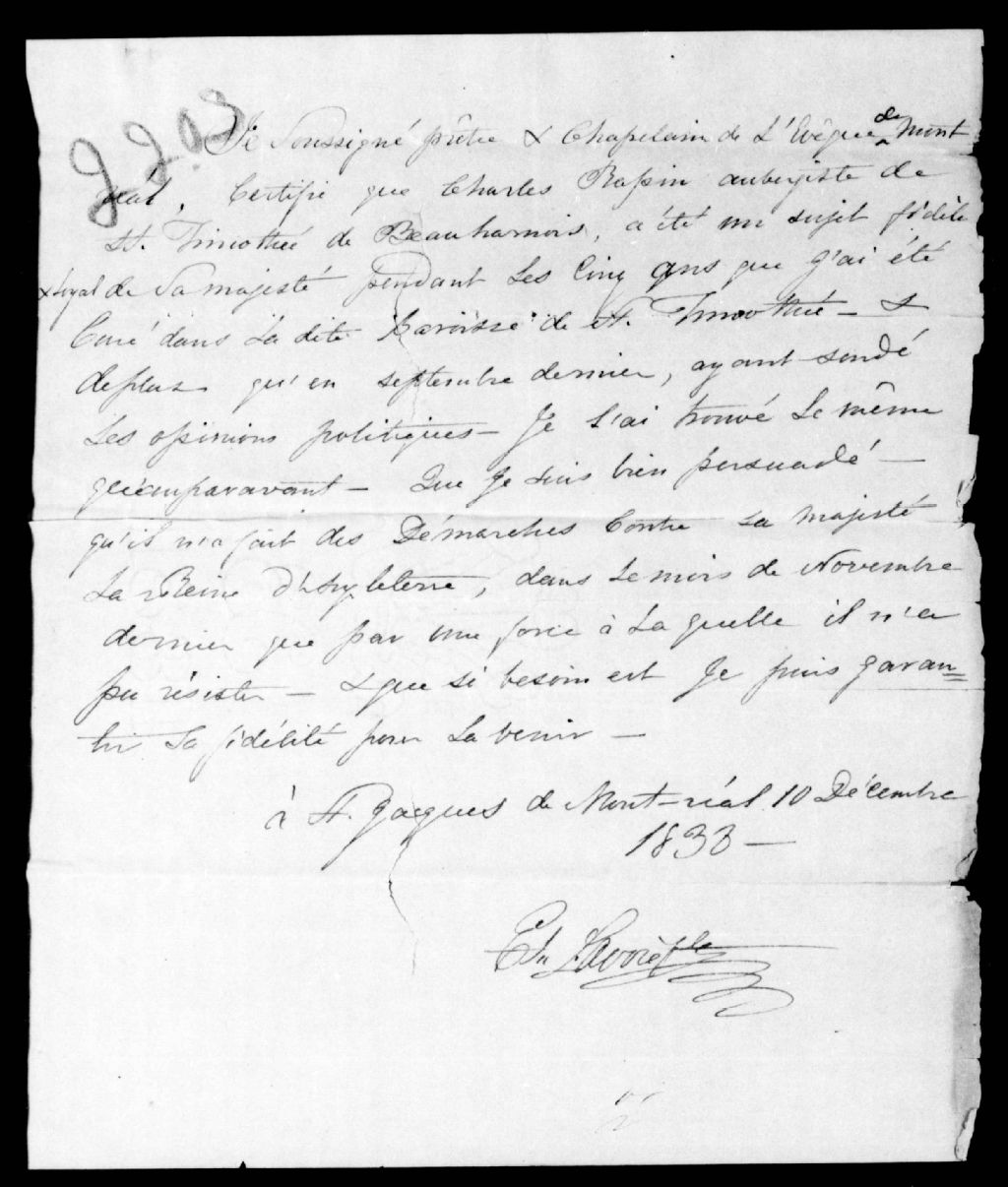 Certificat d'E. Lavoie, prêtre et chapelain de l'évêque de Montréal, en faveur de Charles Rapin, 10 décembre 1838, Archives nationales à Québec, Fonds Ministère de la Justice, (03Q,E17,S37,D2203).