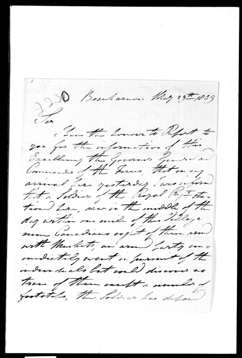- Lettre rédigée à Beauharnois par le lieutenant John Campbell adressée au major Goldie