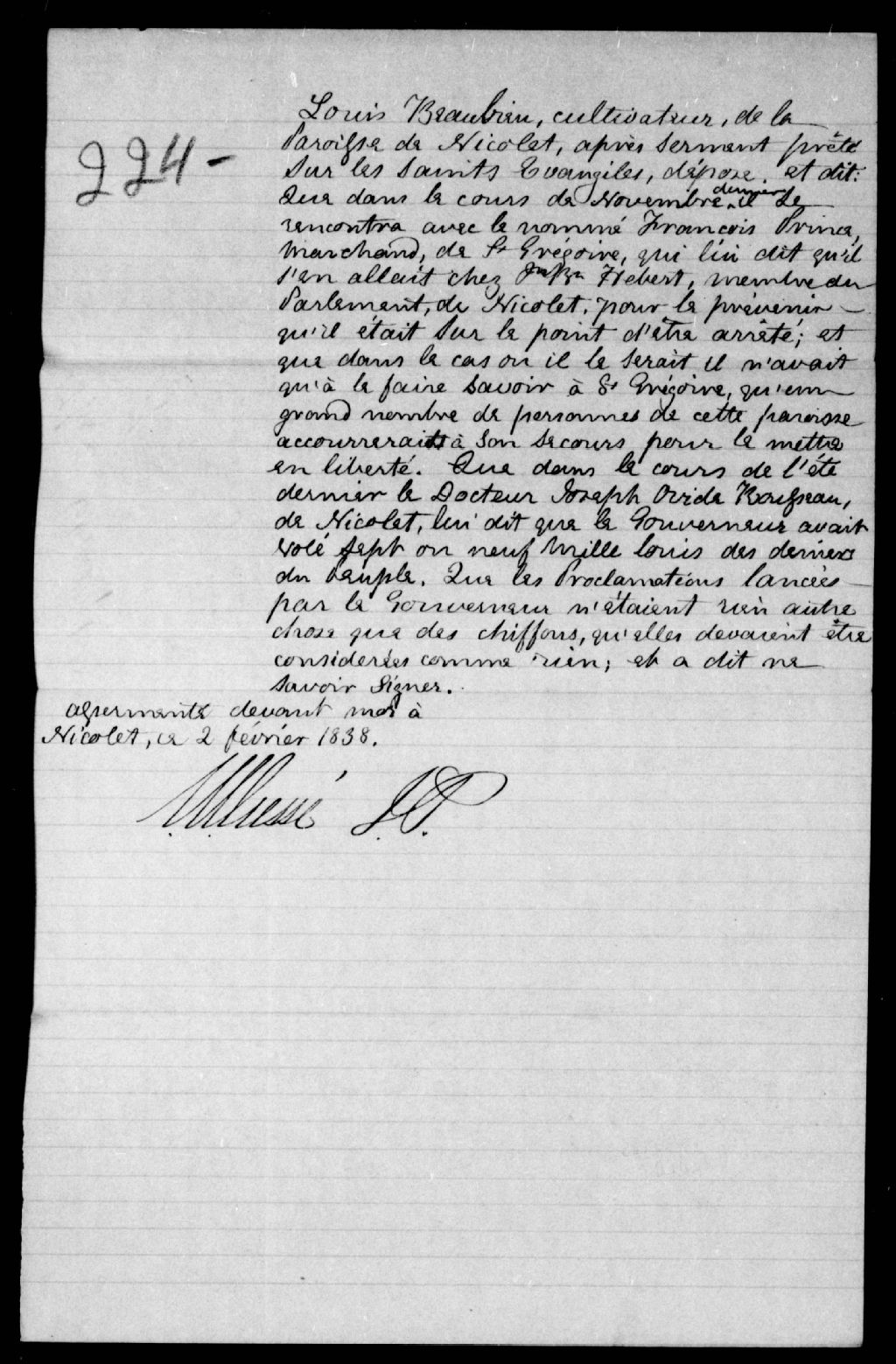 Affidavit de Louis Beaubien, contre François Prince, marchand, et le docteur Ovide Rousseau, de Nicolet