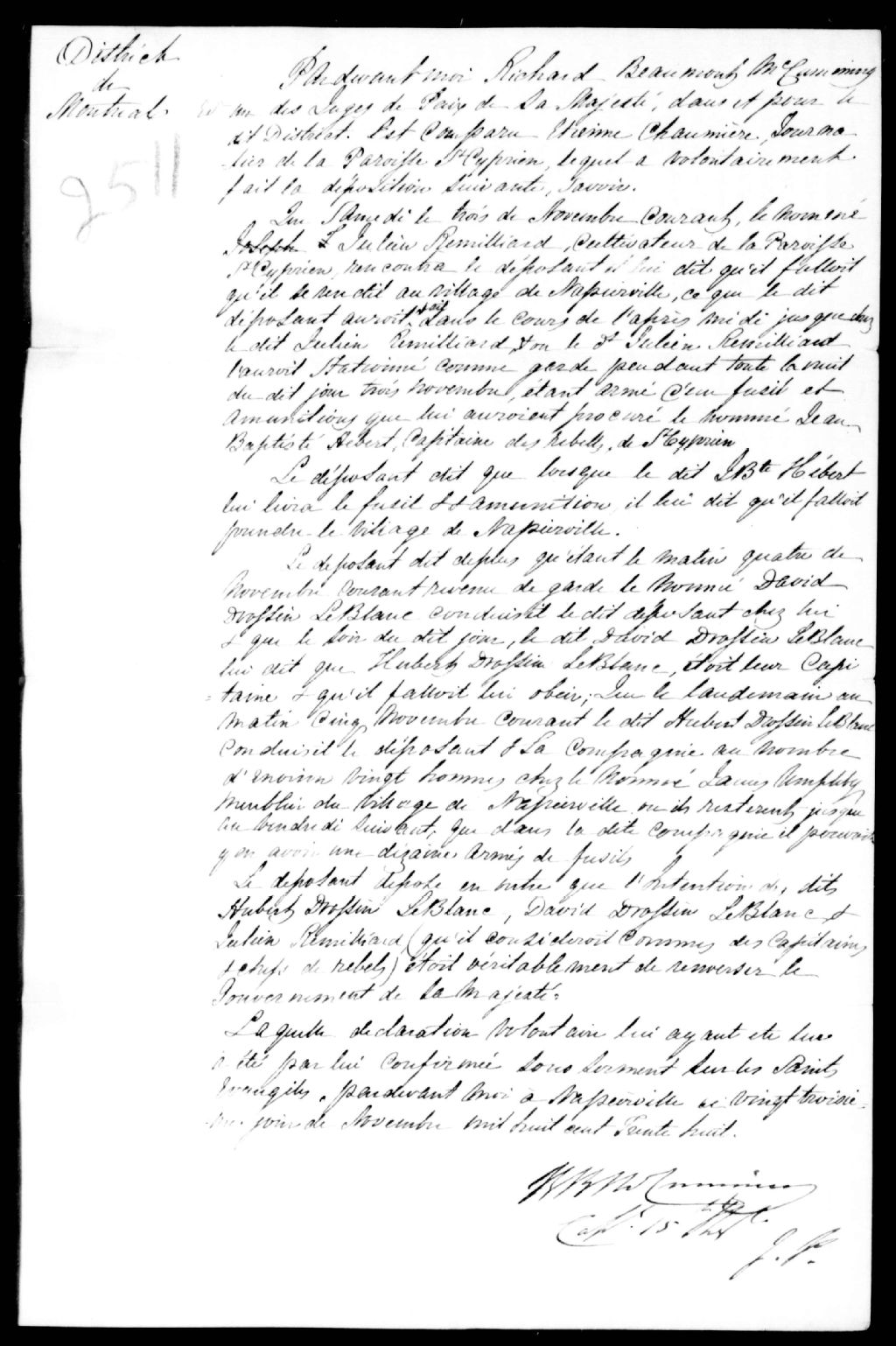 Déposition d'Étienne Chaumière contre David Drossin Leblanc, Hubert Drossin Leblanc, Théophile Decoigne, François Bigonesse dit Beaucaire, Achille Morin, Louis Lemelin et un officier français, 23 novembre 1838, Archives nationales à Québec, Fonds Ministère de la Justice, (03Q,E17,S37,D2511).