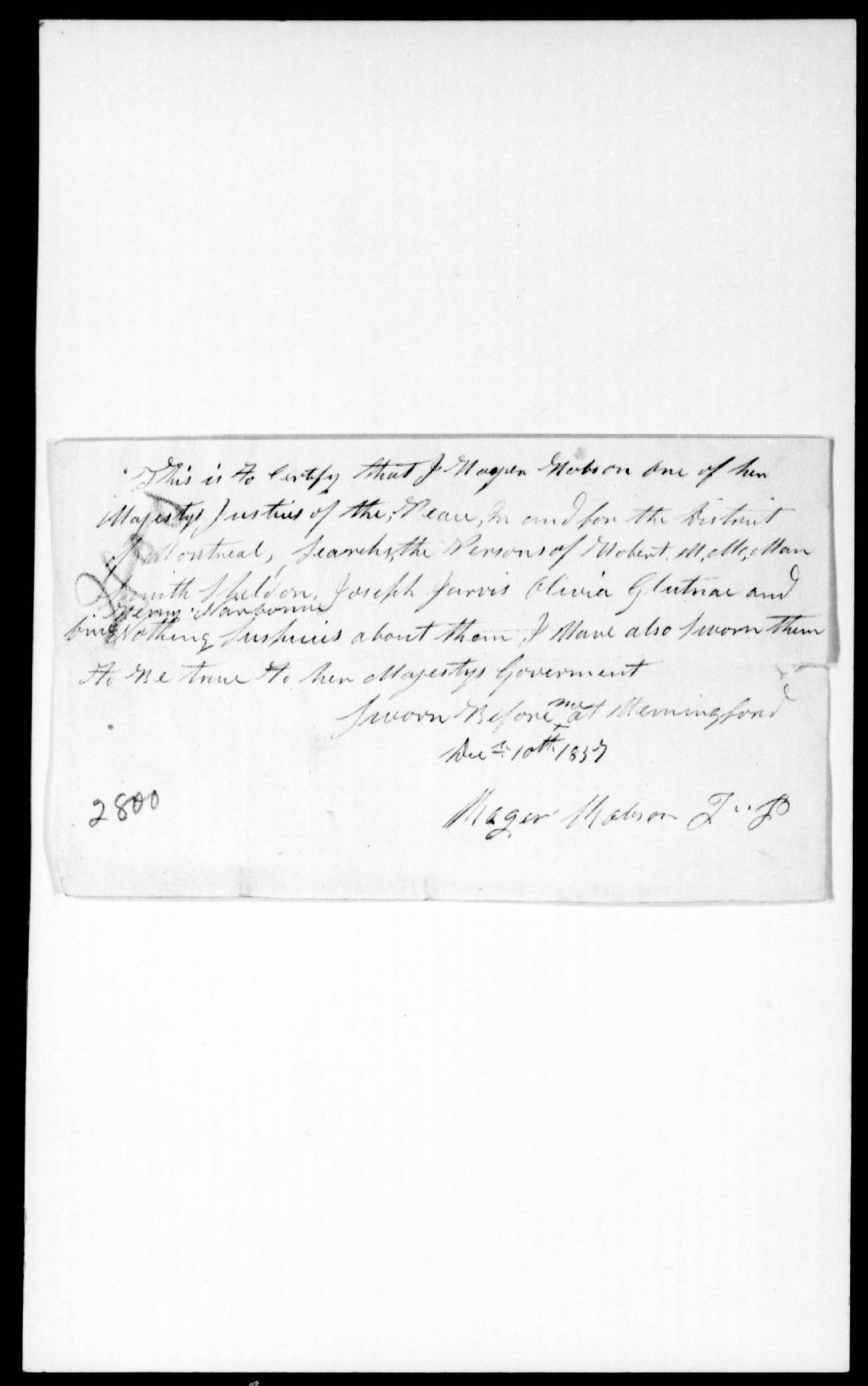 - Certificat de Rodger Robson, juge de paix à Hemmingford