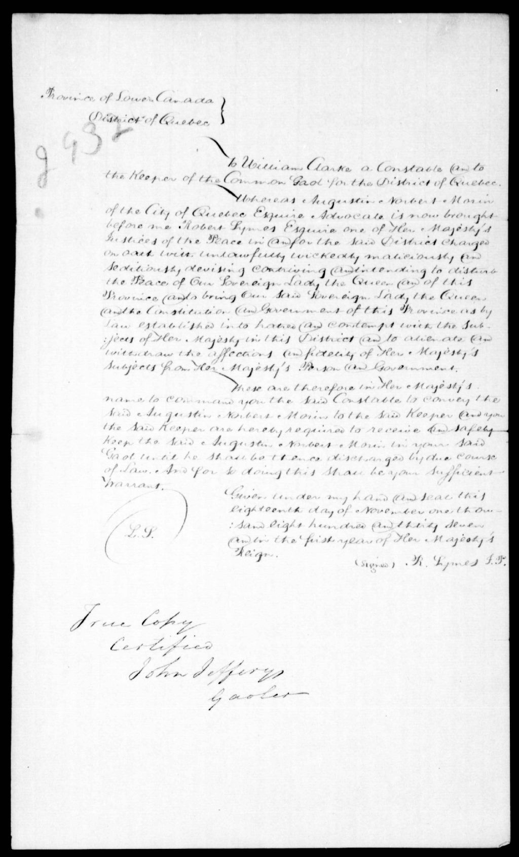 Mandat d'arrestation contre Auguste-Norbert Morin (Augustin-Norbert Morin), signé R. Symes J. P, 18 novembre 1837, Archives nationales à Québec, Fonds Ministère de la Justice, (03Q,E17,S37,D2932).