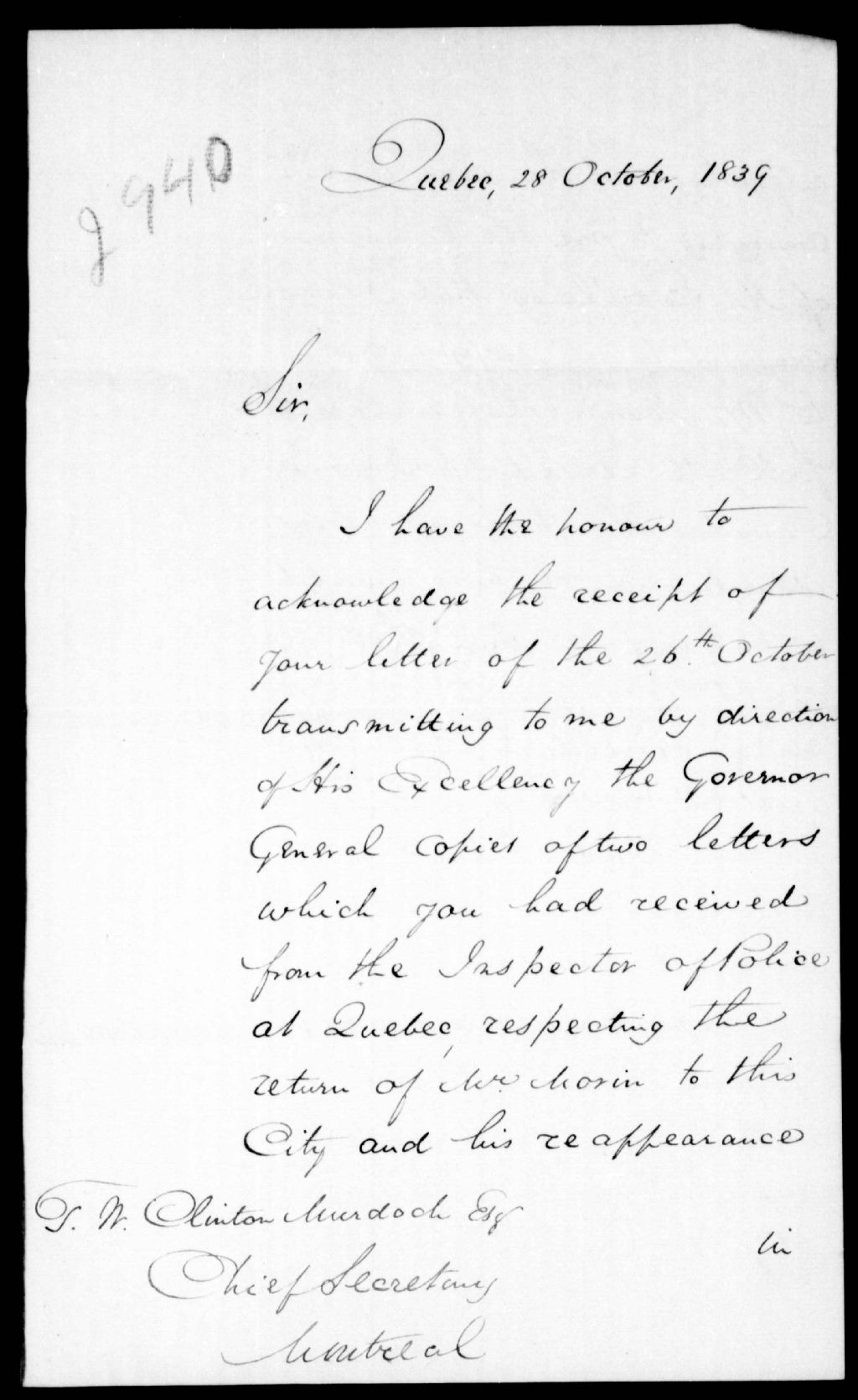 Lettre de Charles Richard Ogden, procureur général, à W. C. Murdock, secrétaire civil, 28 octobre 1839, Archives nationales à Québec, Fonds Ministère de la Justice, (03Q,E17,S37,D2940).
