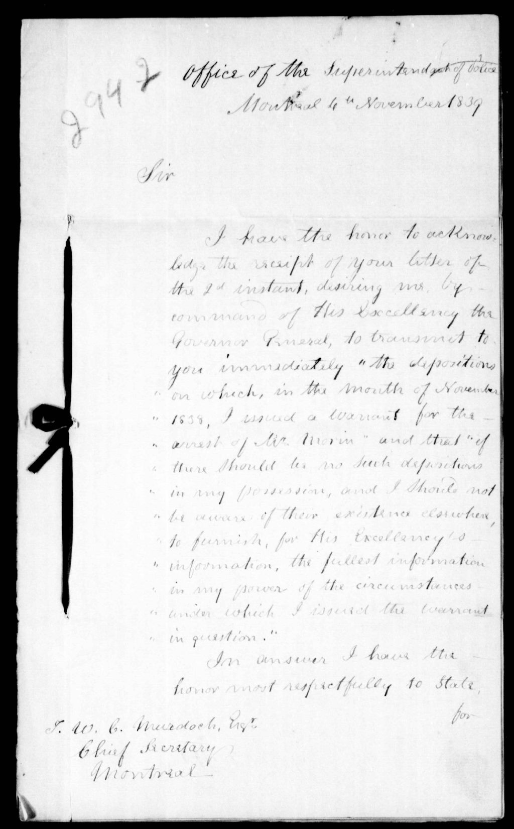 Lettre de P.-E. Leclerc à W. Clinton Murdock, 4 novembre 1839, Archives nationales à Québec, Fonds Ministère de la Justice, (03Q,E17,S37,D2942).