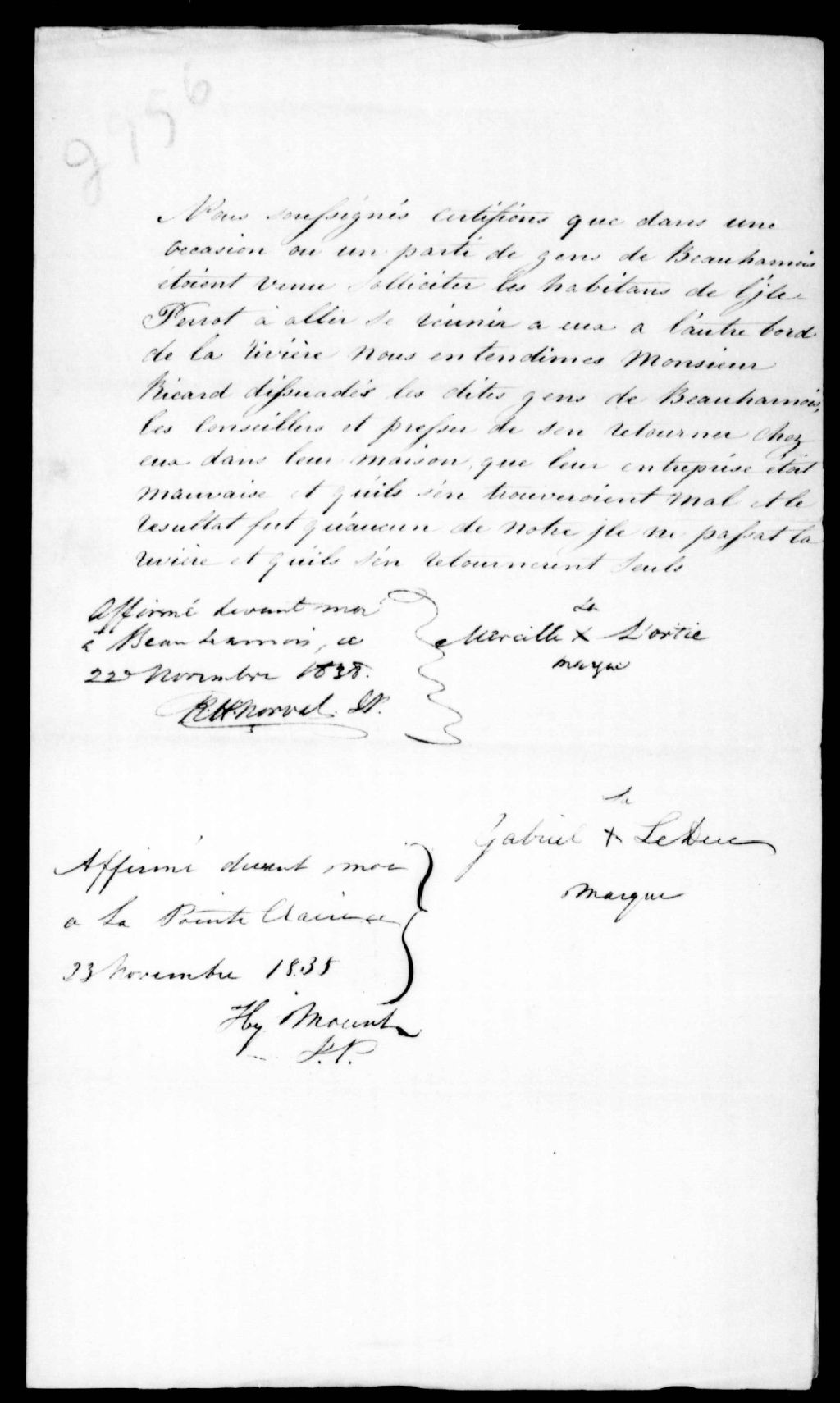 Certificat de loyauté en faveur de M. Ricard, signé par Marcille Lortie et Gabriel Leclerc, 23 novembre 1838, Archives nationales à Québec, Fonds Ministère de la Justice, (03Q,E17,S37,D2956).