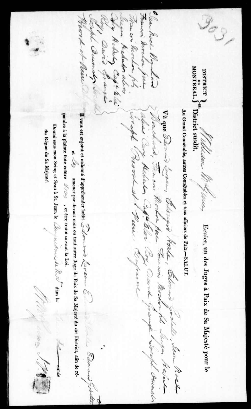 Mandat d'arrestation émis par W. McGinnis contre Édouard Lareau, Édouard Houle, Édouard Godette, Jean-Noël Bouchard, François Rochon père, François Rochon fils, Jacques Hébert alias Cary Hébert, capitaine Eloi Roy, David Grangé, Joseph Ouimet, Joseph Provost et Pierre Dufresne, 5 novembre 1838, Archives nationales à Québec, Fonds Ministère de la Justice, (03Q,E17,S37,D3031).
